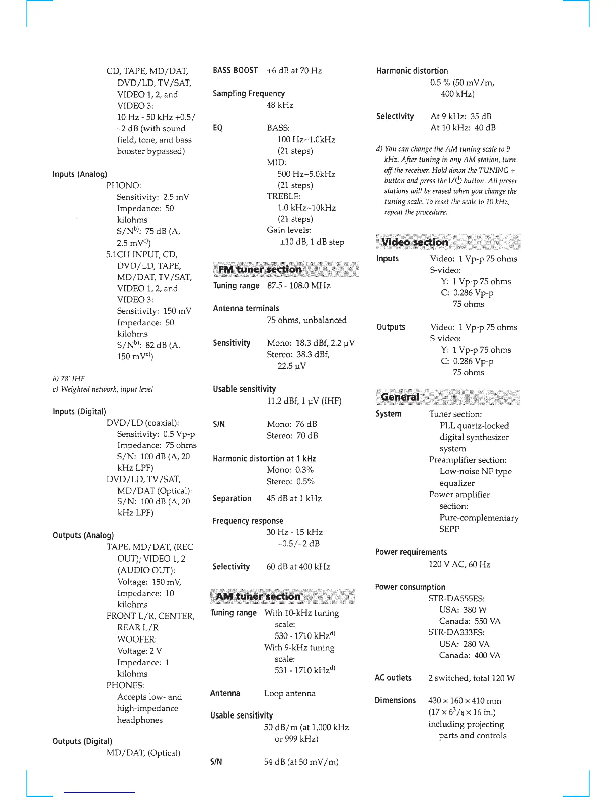 Sony STR-DA333ES - Tuner and Input;Output Specs; General System and Power Specs