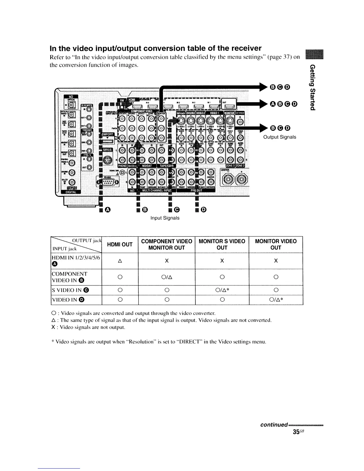 the video input/output conversion table of the receiver
