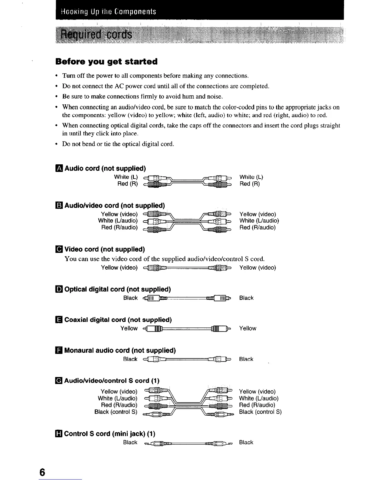 When connecting an audio/video cord, be sure to match the color-coded pins to the appropriate jacks on