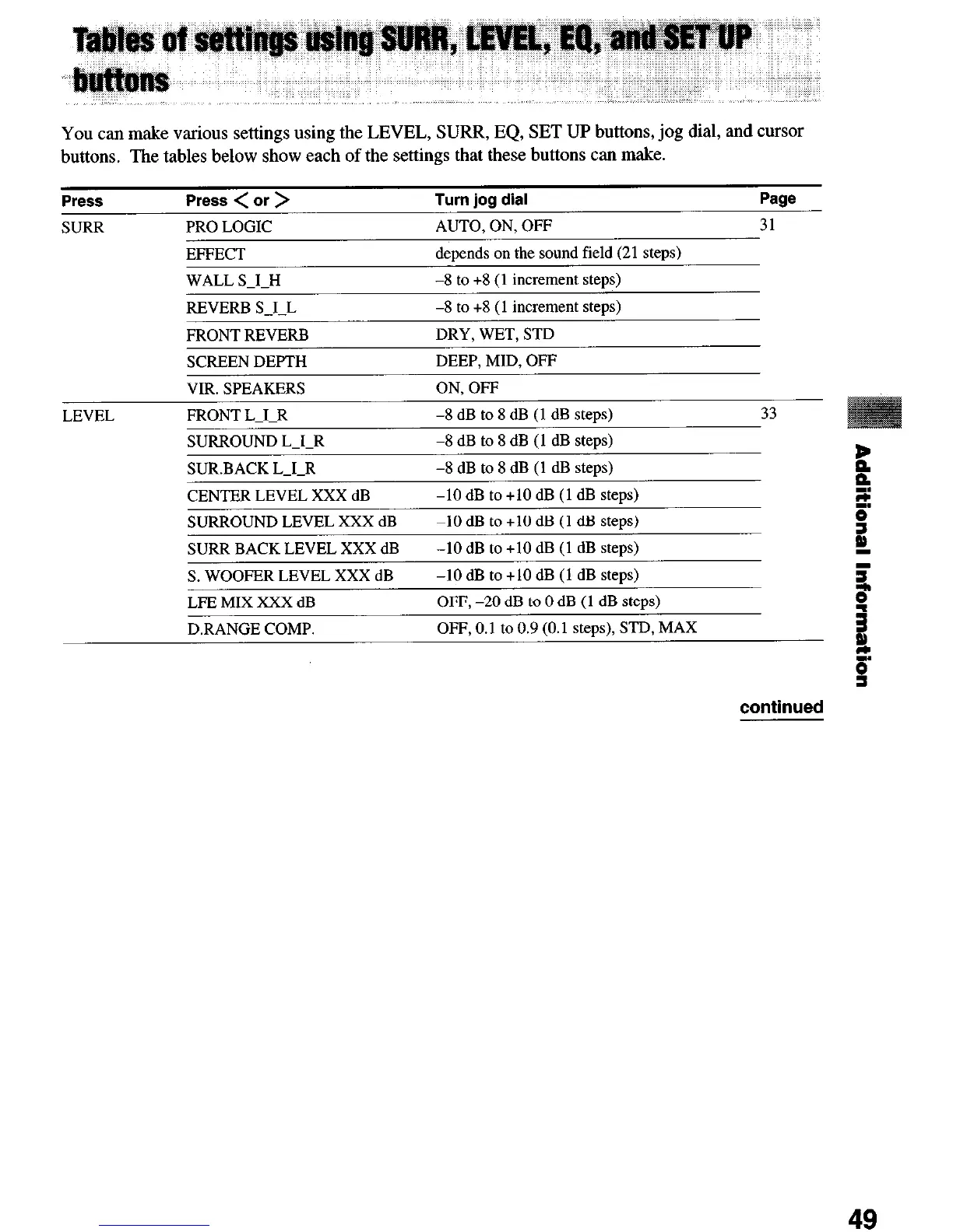 SURR BACK LEVEL XXX dB