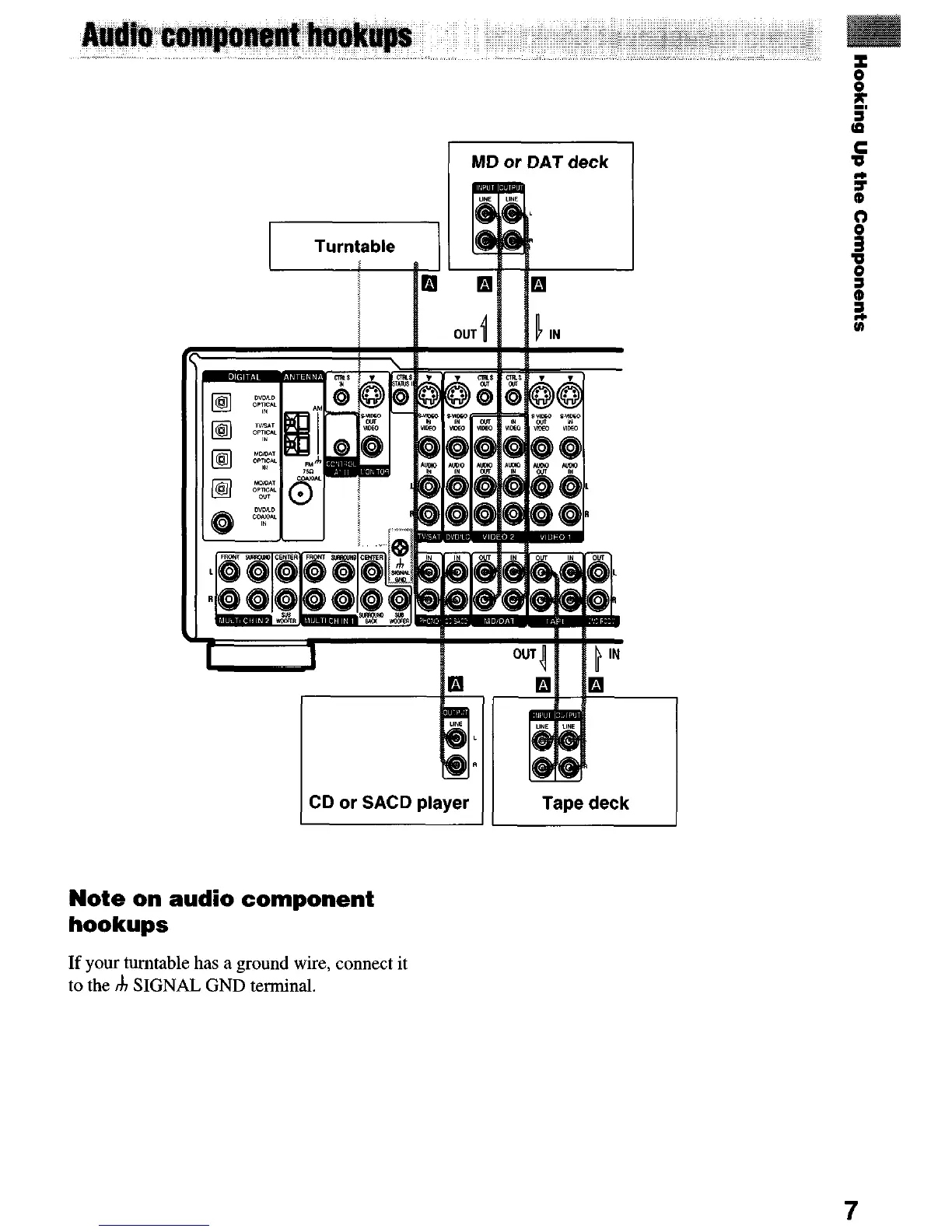 Sony STR-DE1075 - Audio Component Hookups; Connecting Turntable, MD;DAT, and Tape Decks; Connecting CD;SACD Players; Turntable Ground Wire Connection
