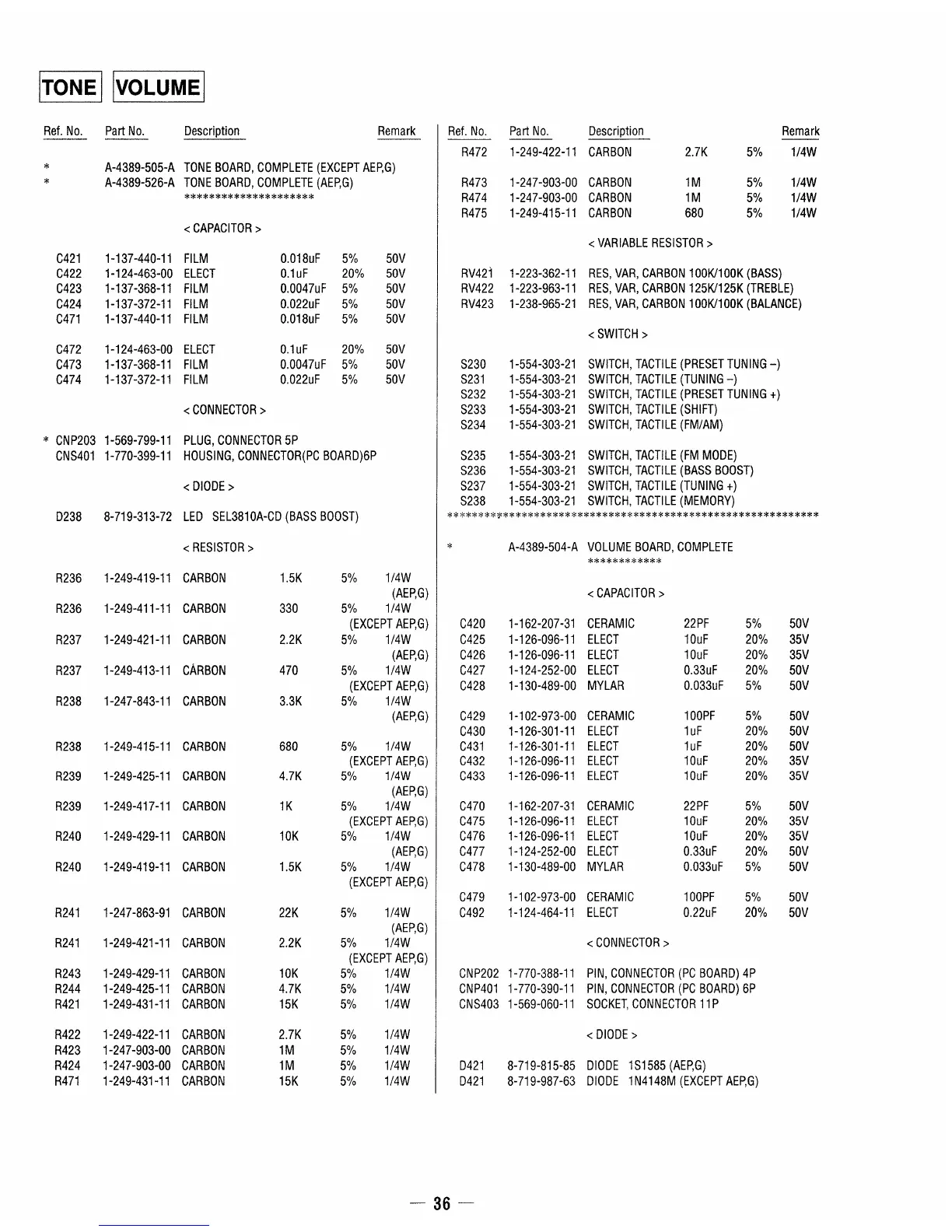 Sony STR-DE305 - Tone Parts; Volume Parts