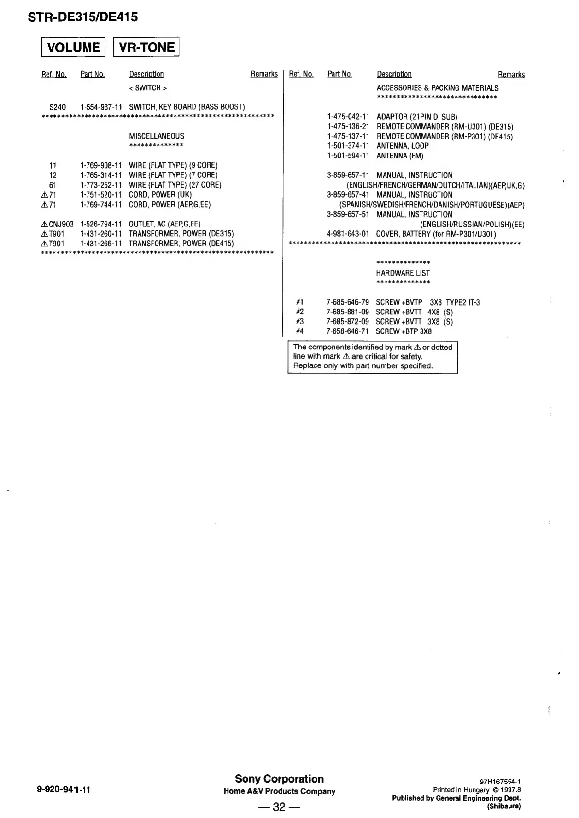 Sony STR-DE315 - Accessories and Miscellaneous; Included Accessories and Hardware; Miscellaneous Items and Manuals