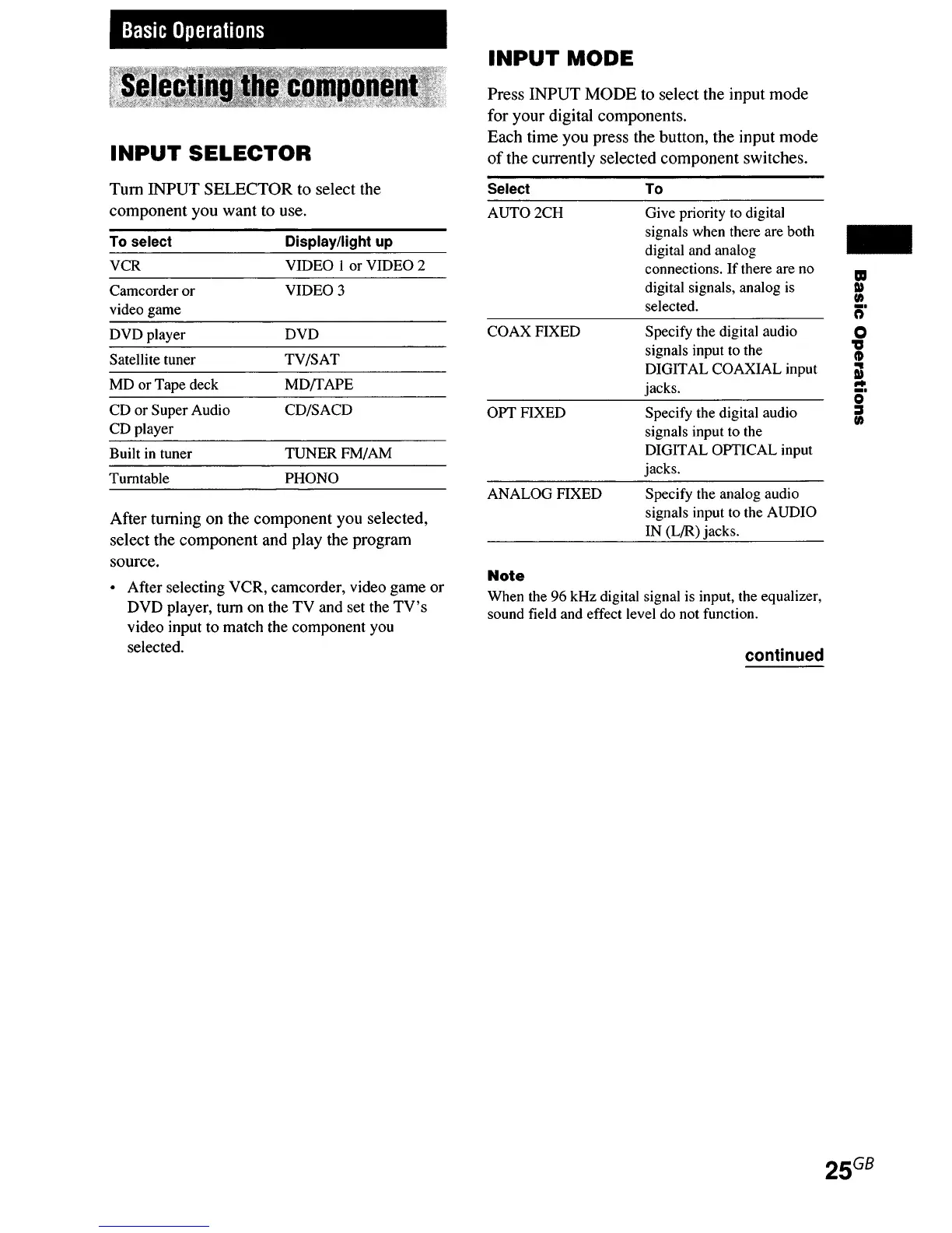 Sony STR-DE995 - Basic Operations; Selecting the Component; Input Selector; Input Mode