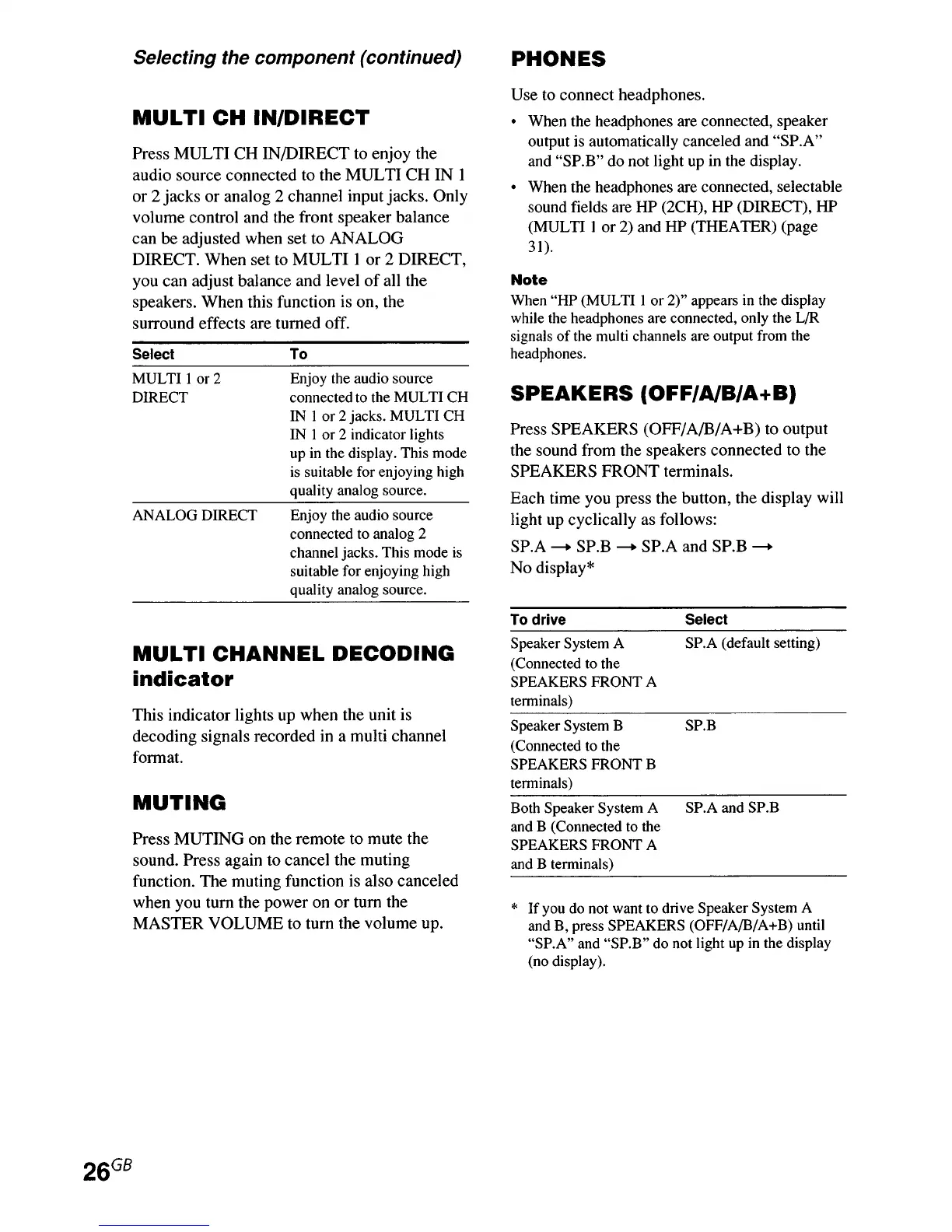 Sony STR-DE995 - Multi CH In;Direct; Muting; Phones; Speakers (OFF;A;B;A+B)