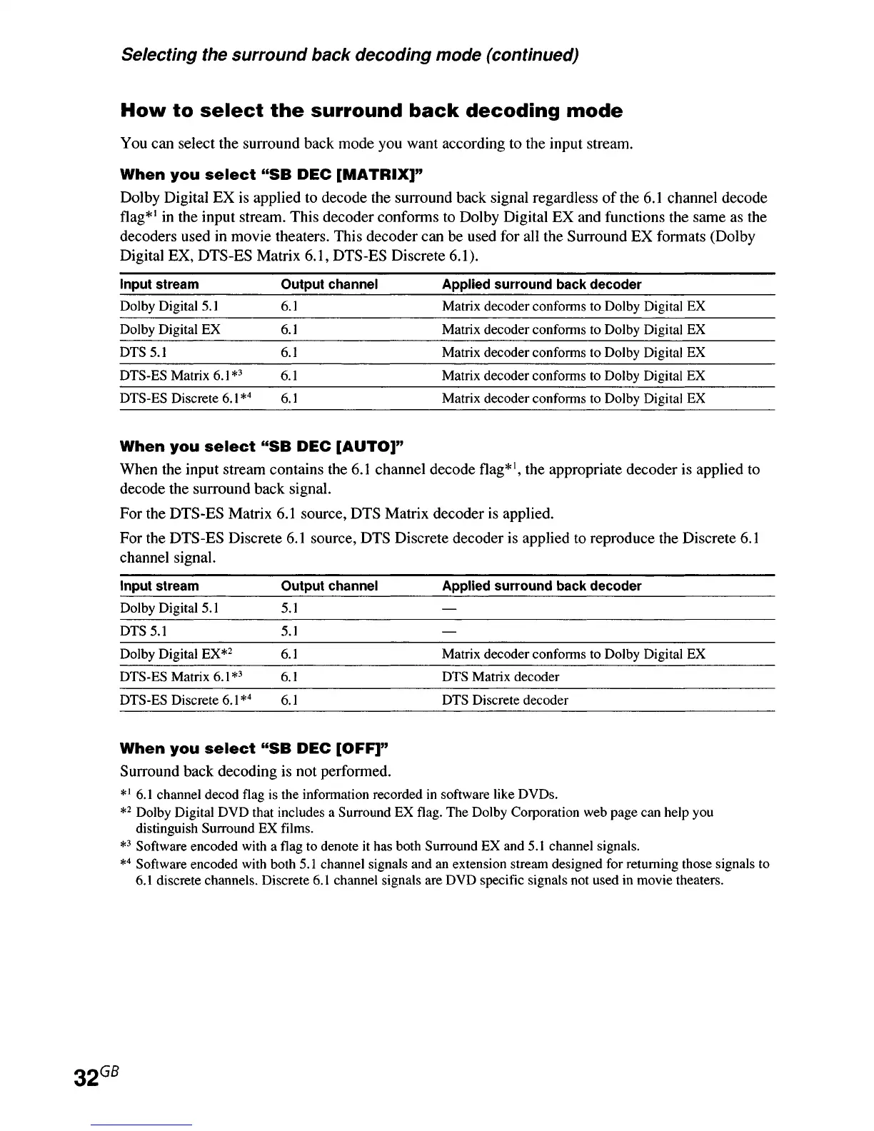 Sony STR-DE995 - How to Select the Surround Back Decoding Mode; When You Select SB DEC [MATRIX]; When You Select SB DEC [AUTO]; When You Select SB DEC [OFF]