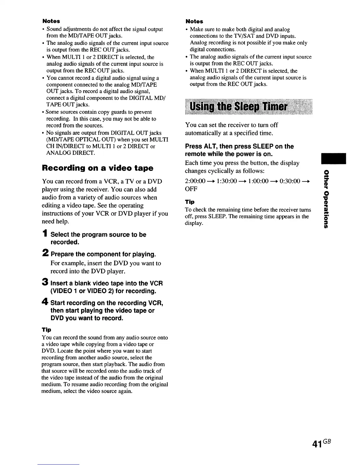 Sony STR-DE995 - Using the Sleep Timer; Recording on a Video Tape