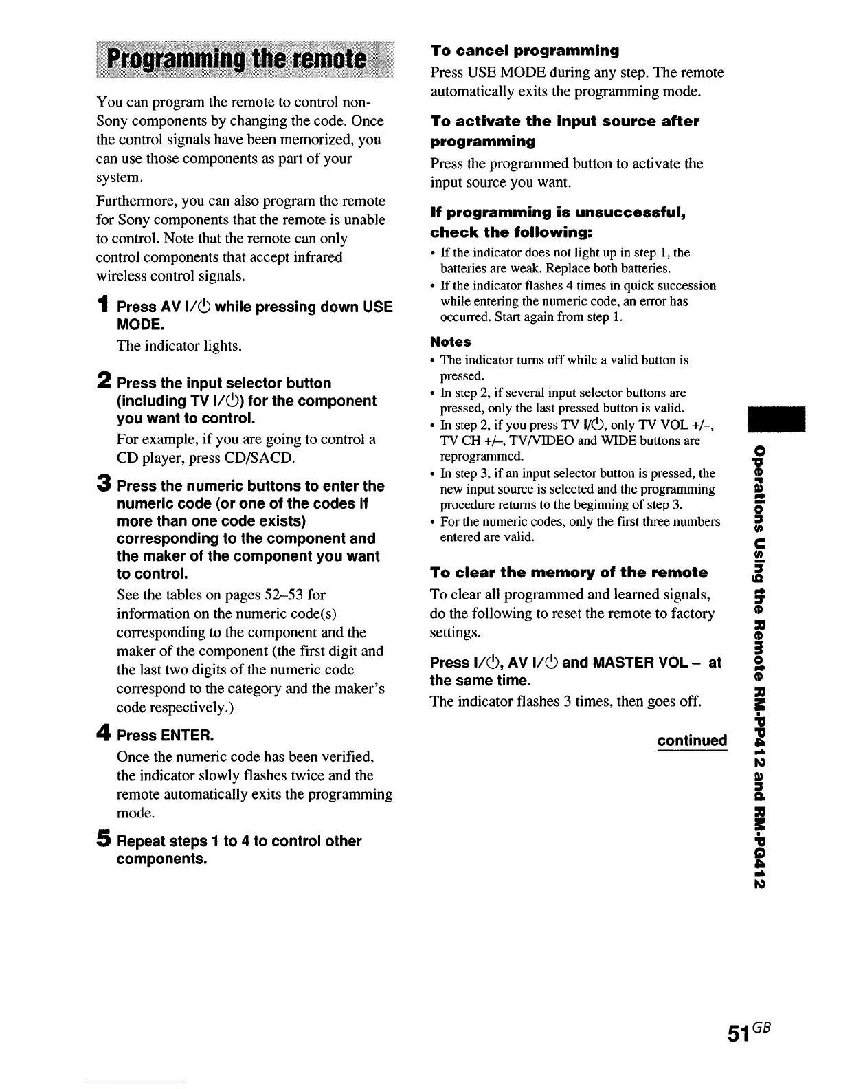 Sony STR-DE995 - Programming the Remote; To Cancel Programming; To Activate the Input Source after Programming; To Clear the Memory of the Remote