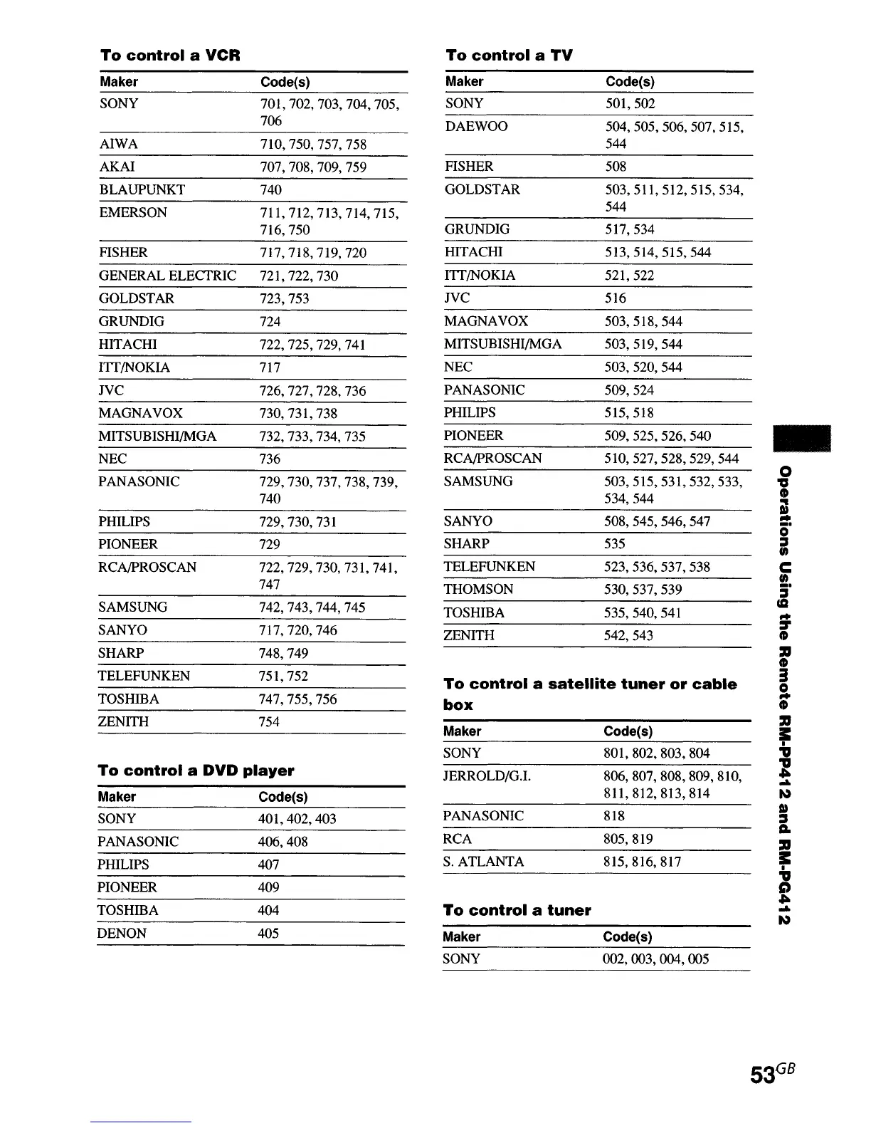 Sony STR-DE995 - To Control a VCR; To Control a DVD Player; To Control a TV; To Control a Satellite Tuner or Cable Box