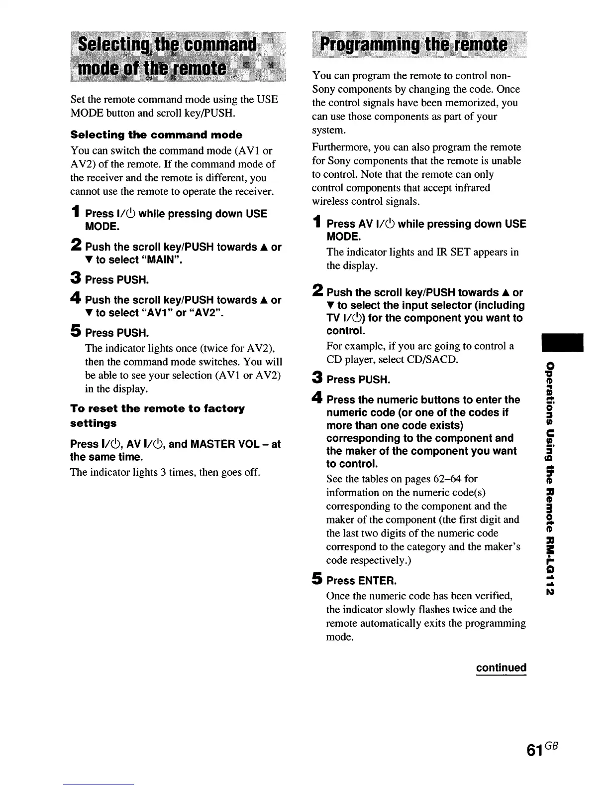 Sony STR-DE995 - Selecting the Command Mode of the Remote; Programming the Remotr; To Reset the Remote to Factory Settings
