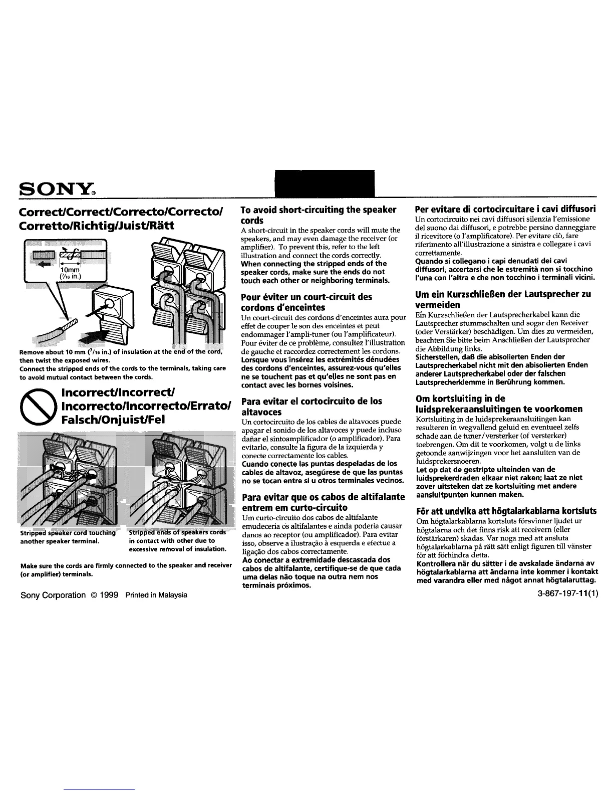Sony STR-DE995 - Correct; Incorrect; To Avoid Short-Circuiting the Speaker Cords