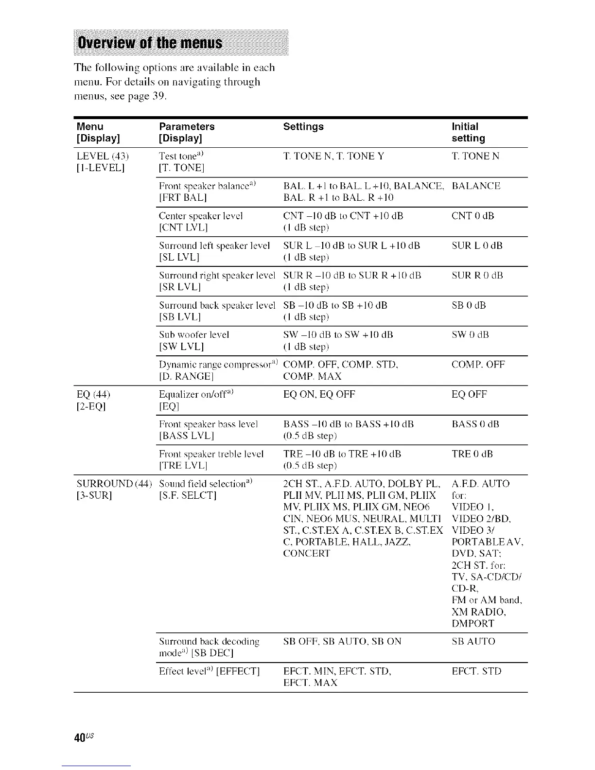 Center speaker level CNT I 0 dB to CNT + 10 dB CNT 0 dB