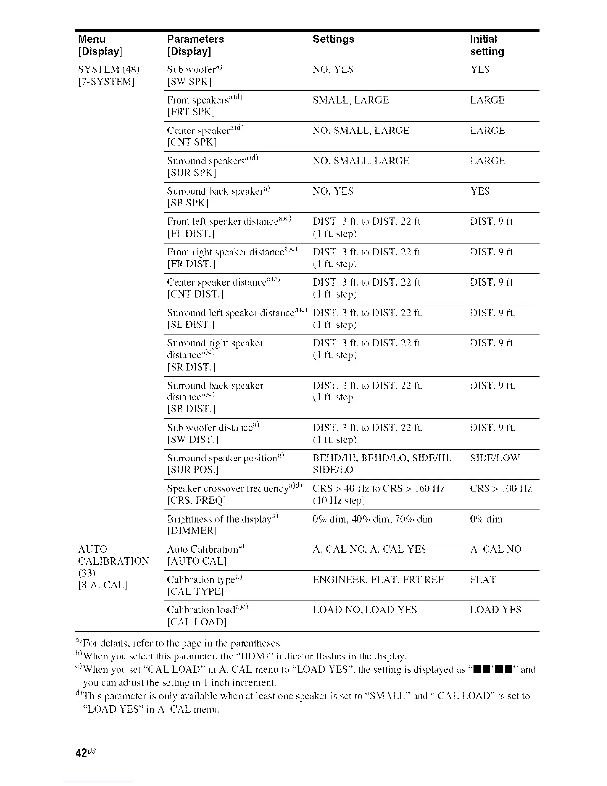d)This parameter is only available when at least one speaker is set to "SMALL" and " CAL LOAD" is set to