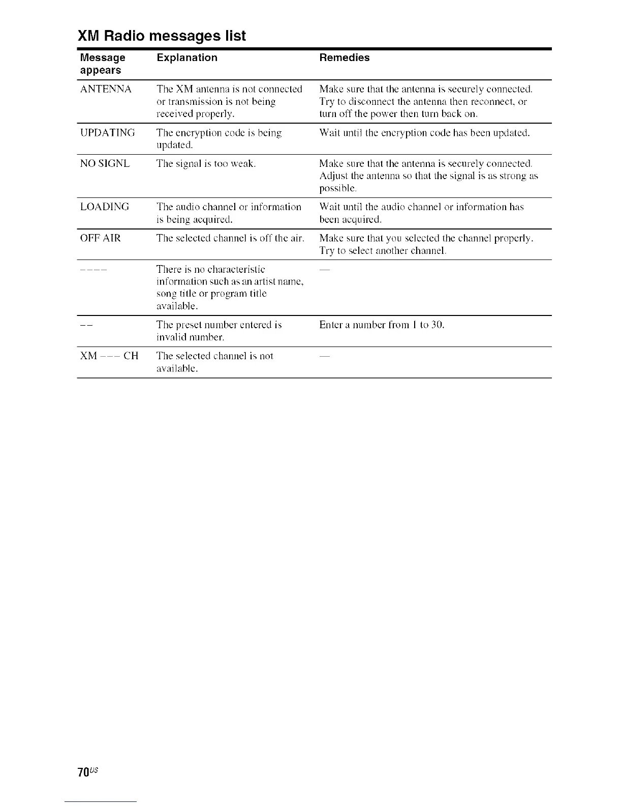 XM Radio messages list