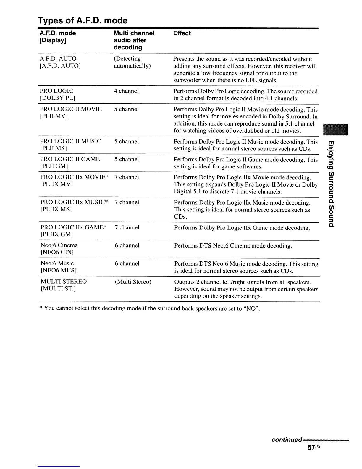 * You cannot select this decoding mode if the surround back speakers are set