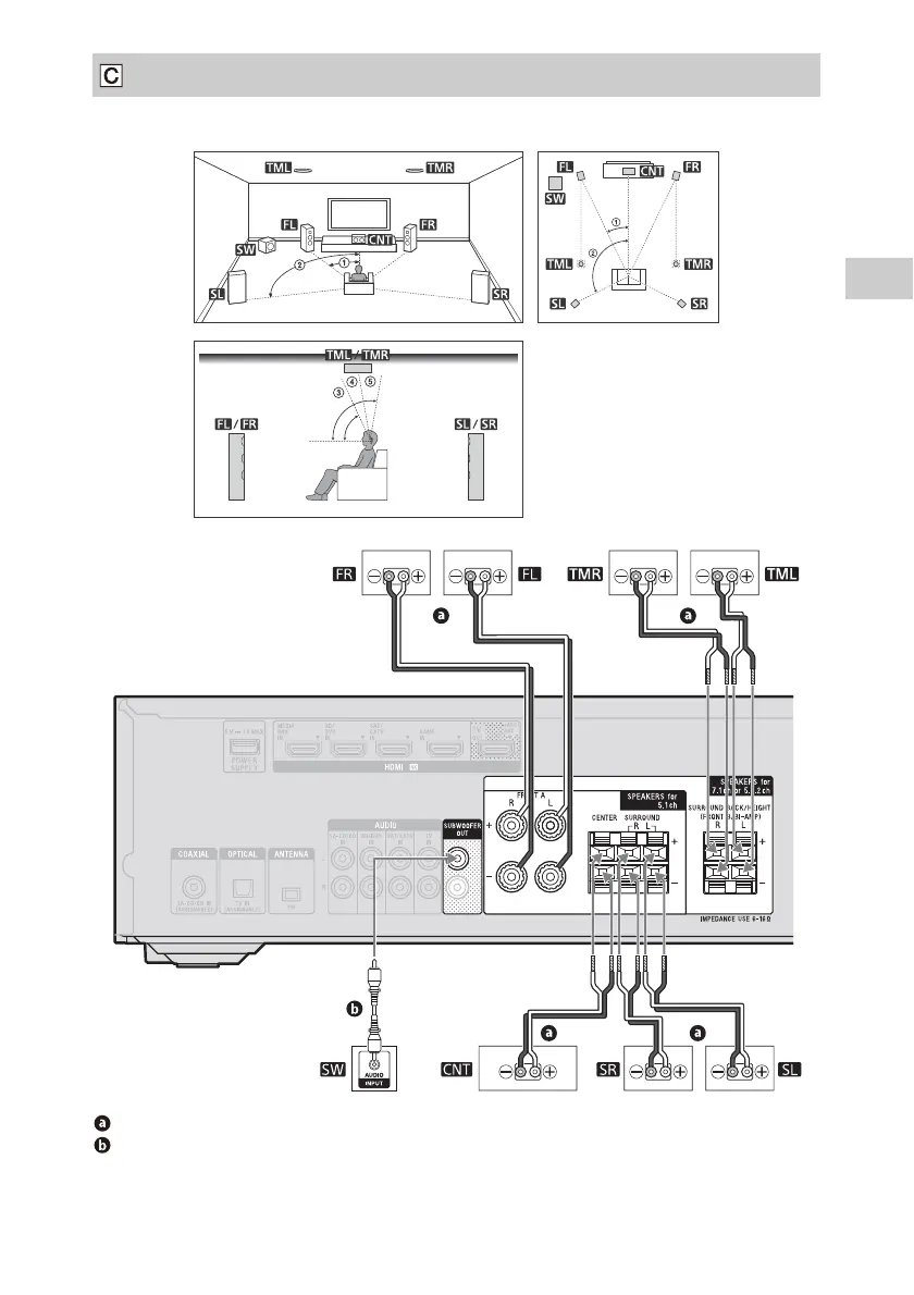 You can enjoy vertical sound effects by connecting additional two top middle speakers.