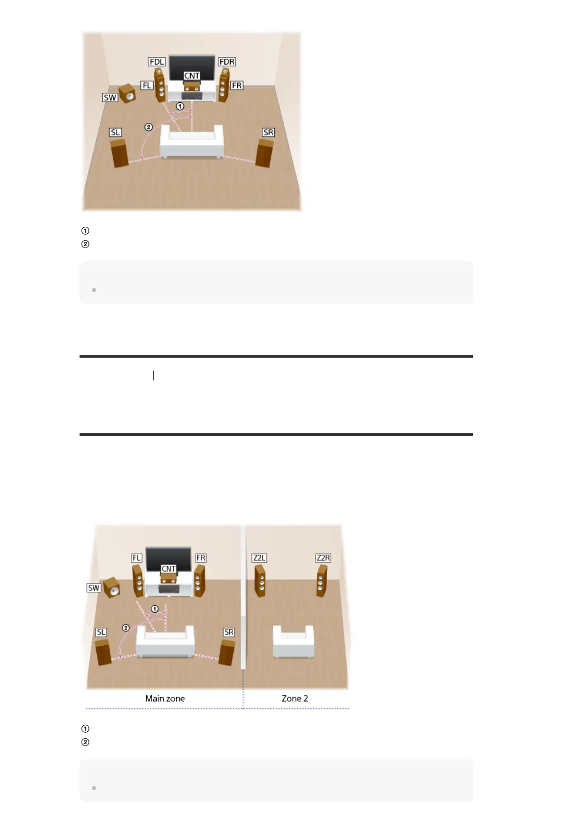 the audio in another location (“Zone 2”) by connecting additional Zone 2 speakers. For example,