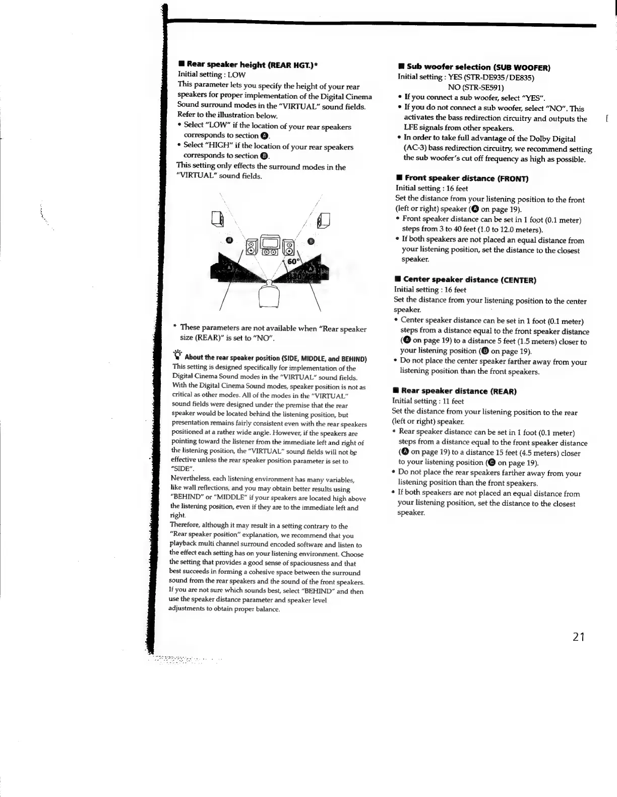 Sony STR-SE591 - Rear speaker height (REAR HGT.); About the rear speaker position (SIDE, MIDDLE, and BEHIND); Sub woofer selection (SUB WOOFER); Front speaker distance (FRONT)