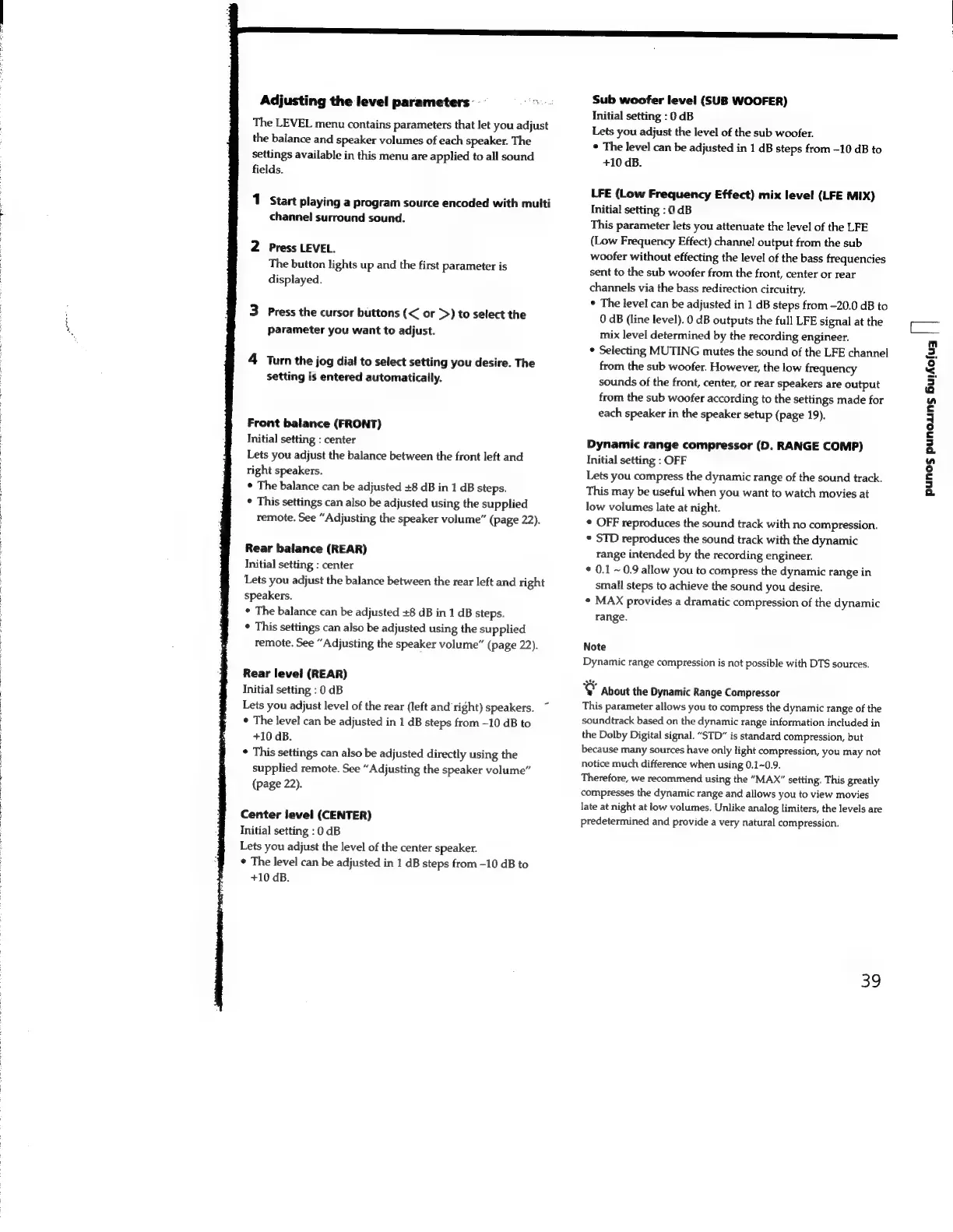 Sony STR-SE591 - Adjusting the level parameters; Front balance (FRONT); Rear balance (REAR); Rear level (REAR)