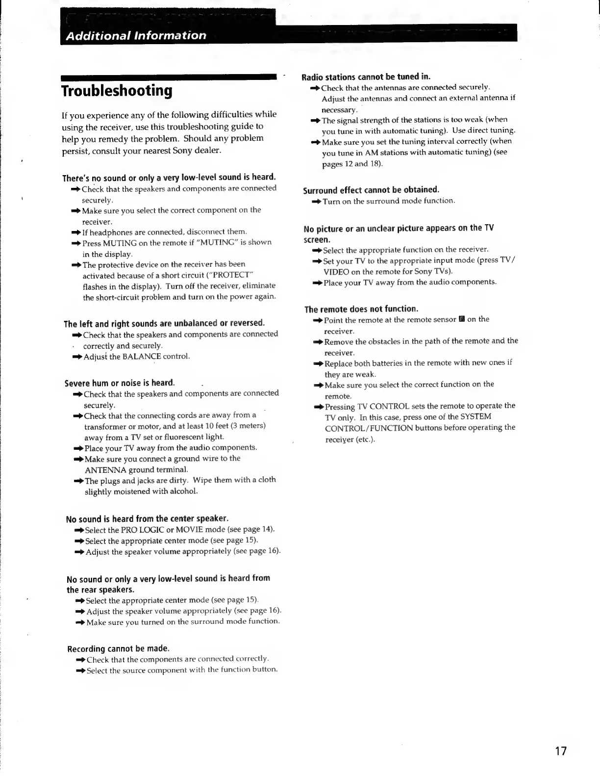 Sony STR-V220 - Automatic Tuning; Additional Information; Troubleshooting