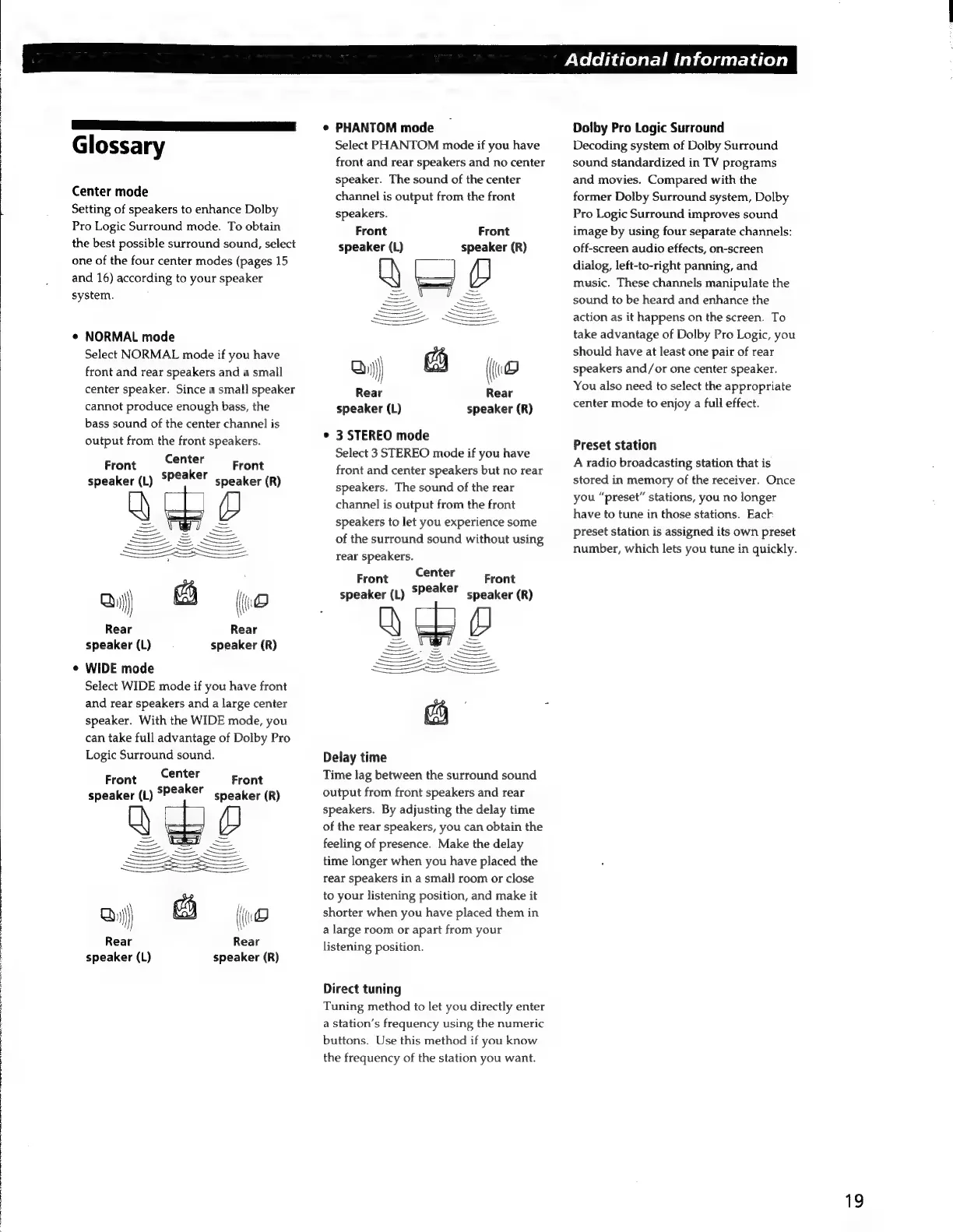 Sony STR-V220 - Glossary; Center Mode; Delay Time; Direct Tuning