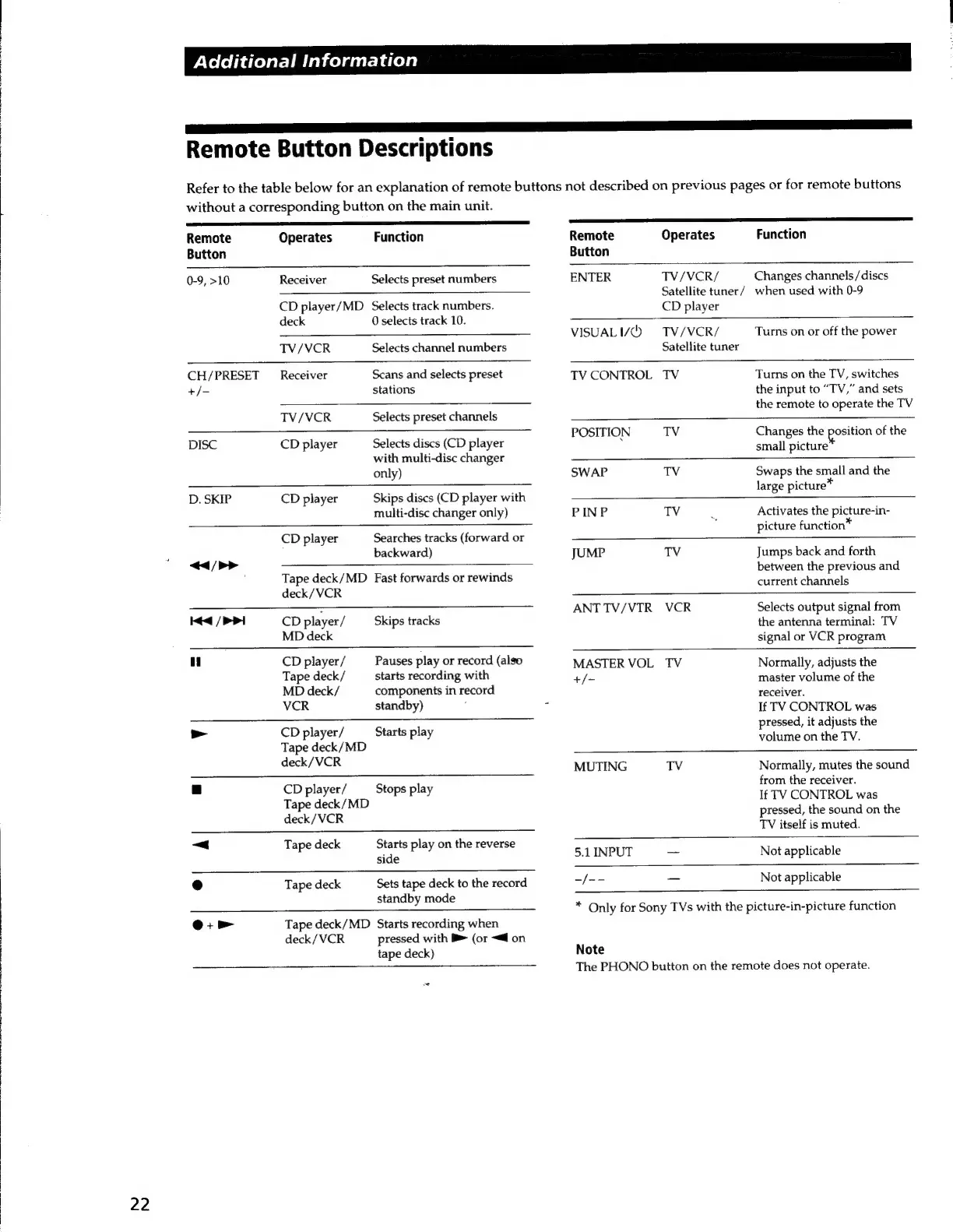 Sony STR-V220 - Remote Button Descriptions