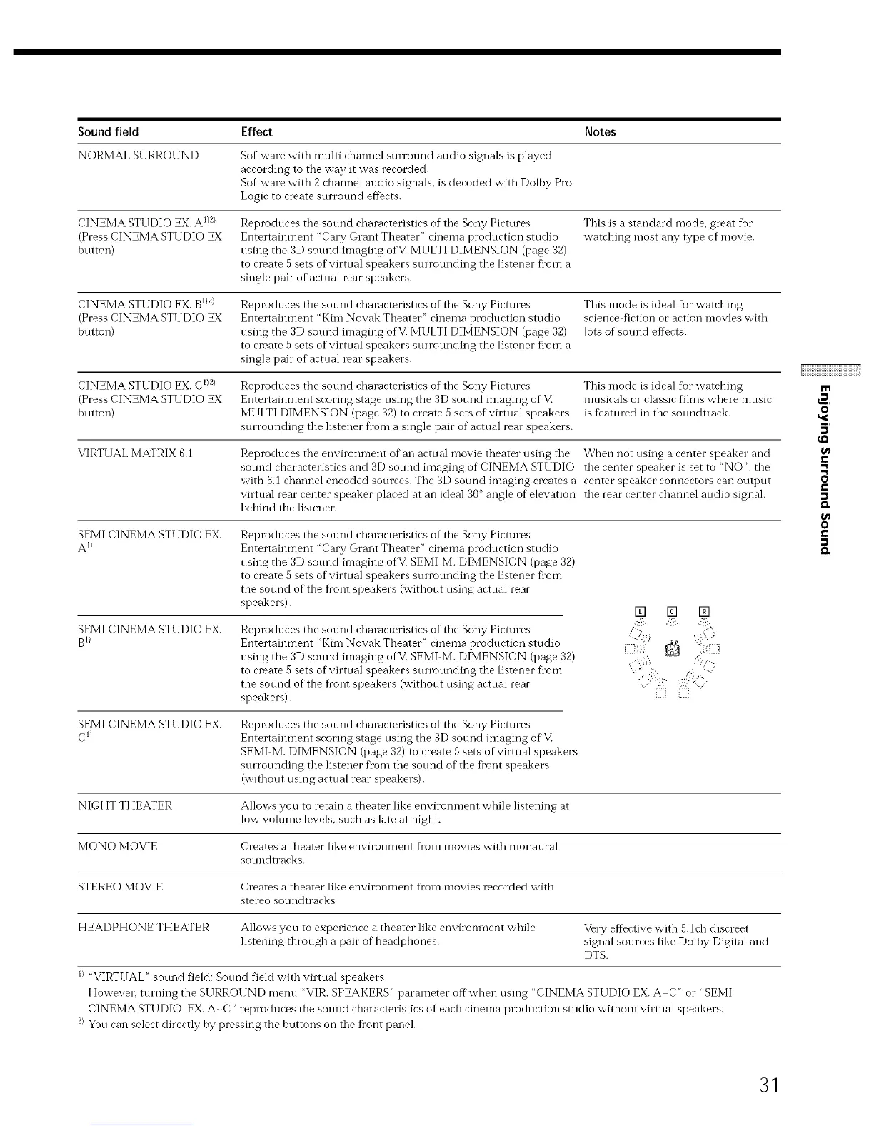 However, turning the SURROUND menu "VIR. SPEAKERS" parameter offwhen using "CINEMA STUDIO EX. A-C" or "SEMI