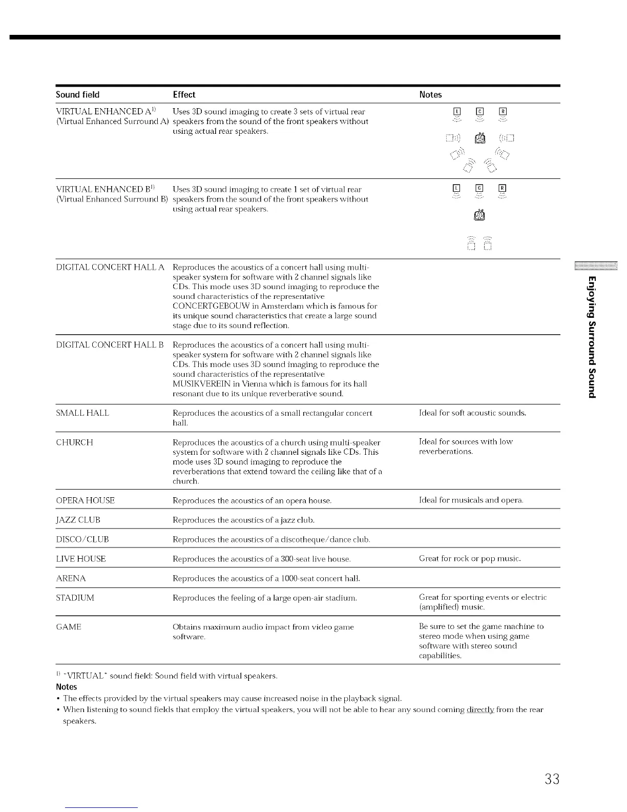 • When listening to sound fieMs that employ the virtual speakers, you will not be able to hear any sound coming _ flora the rear