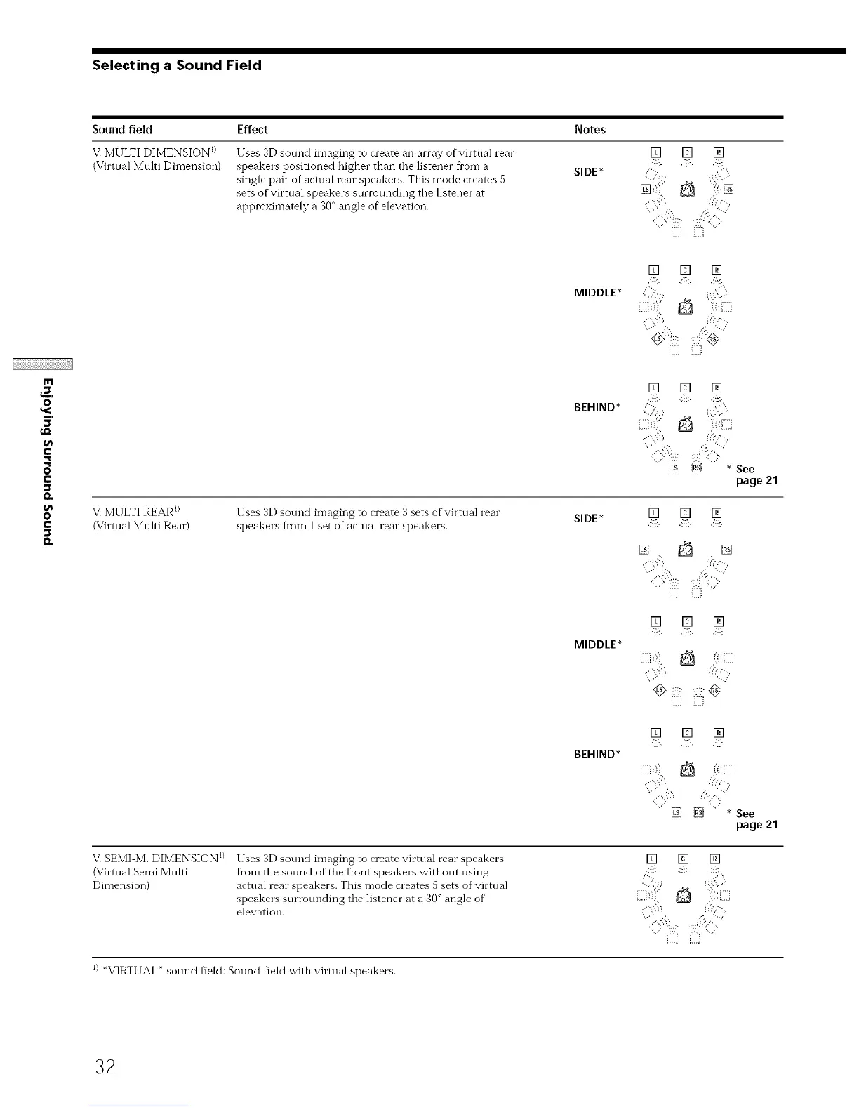 1) "VIRTUAL" sound field: Sound field with virtual speakers.