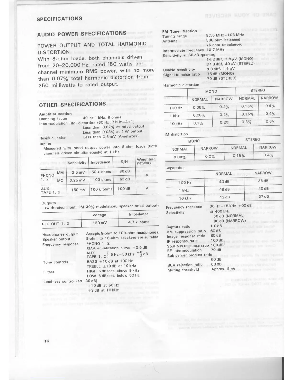 Sony STR-V7 - SPECIFICATIONS; Audio Power Specifications; FM Tuner Specifications; Other Technical Specifications