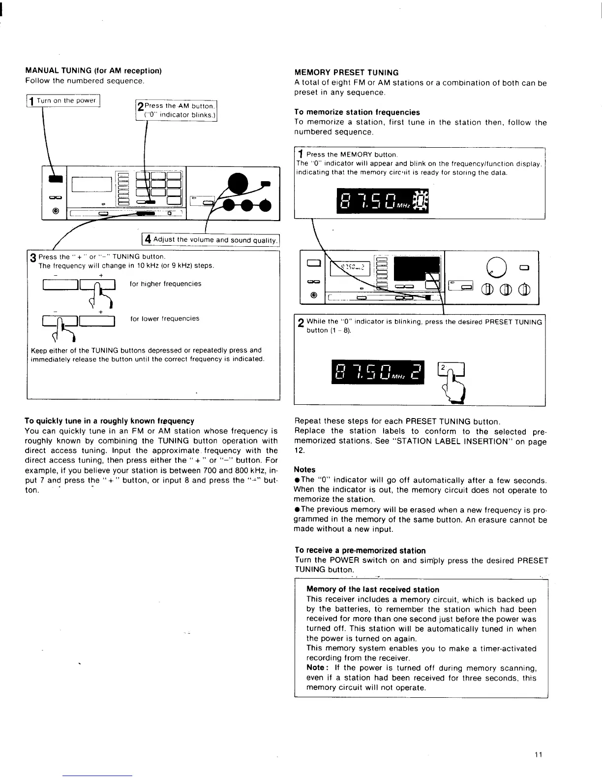 Sony STR-VX250 - Manual Tuning; Memory Preset Tuning; To Quickly Tune in a Roughly Known Frequency; To Memorize Station Frequencies