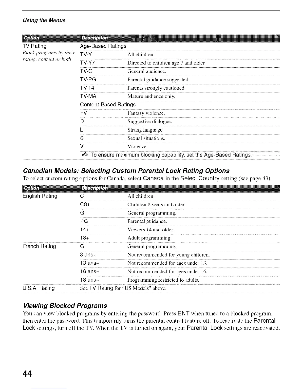 Canadian Models: Selecting Custom Parental Lock Rating Options