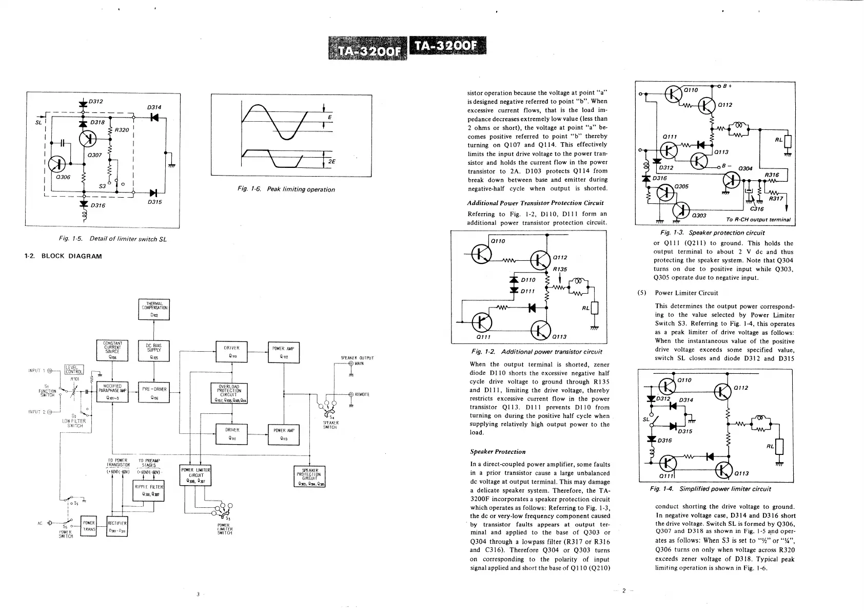 Sony TA-3200F - 1-2. BLOCK DIAGRAM; 1-3. SPEAKER PROTECTION; 1-4. POWER TRANISTOR PROTECTION; 1-5. POWER LIMITER CIRCUIT