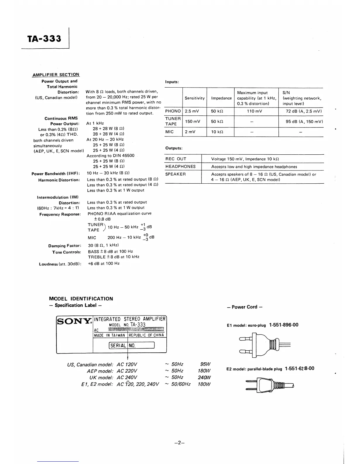 Sony TA-333 - Amplifier Section Details; Power Output and Distortion Specifications; Frequency Response and Tone Control; Model Identification