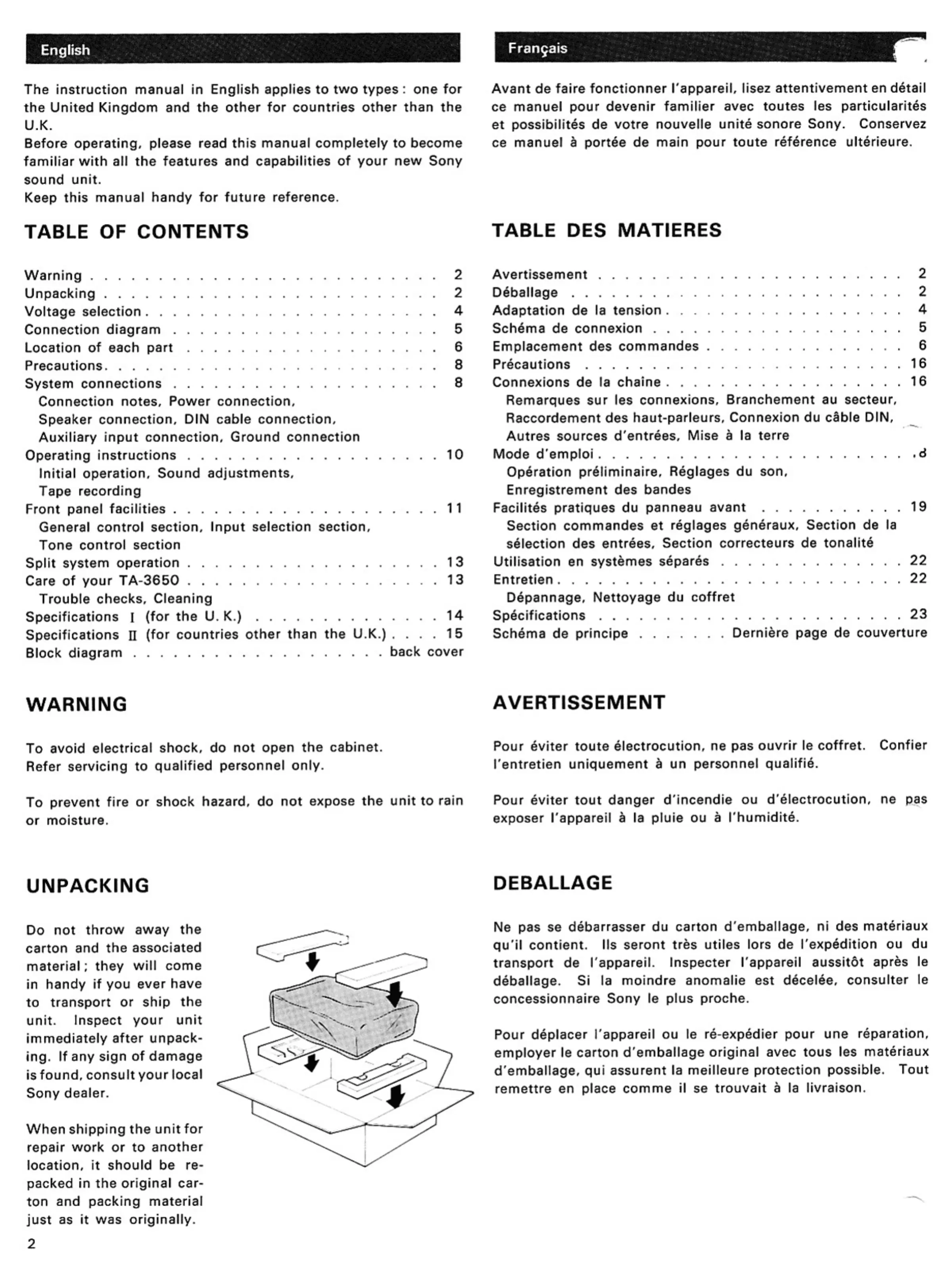 Sony TA-3650 - Safety Information; General Warning; Initial Setup and Configuration; Unpacking and Inspection