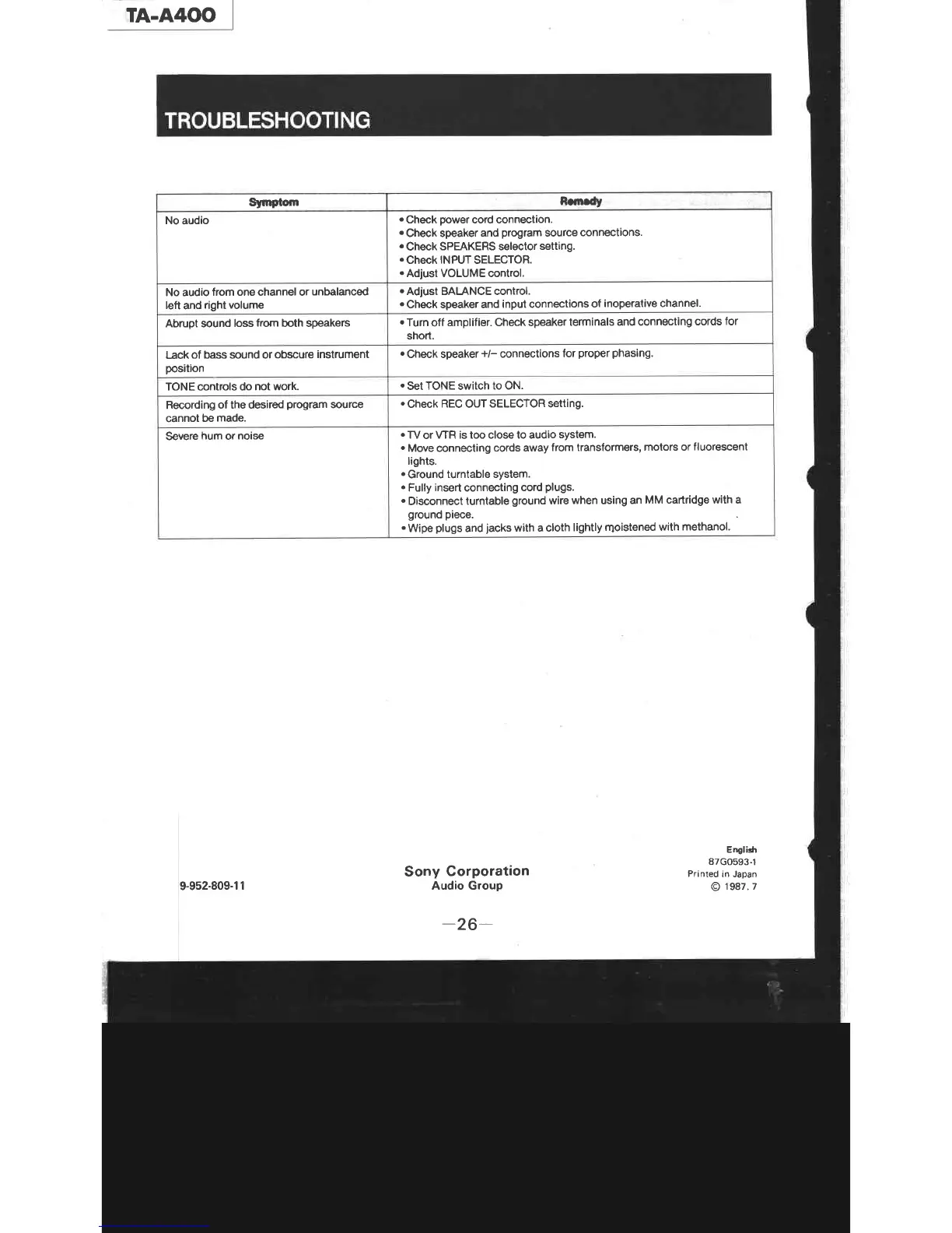 Sony TA-A400 - Troubleshooting; No Audio Output; Unbalanced Audio; Abrupt Sound Loss