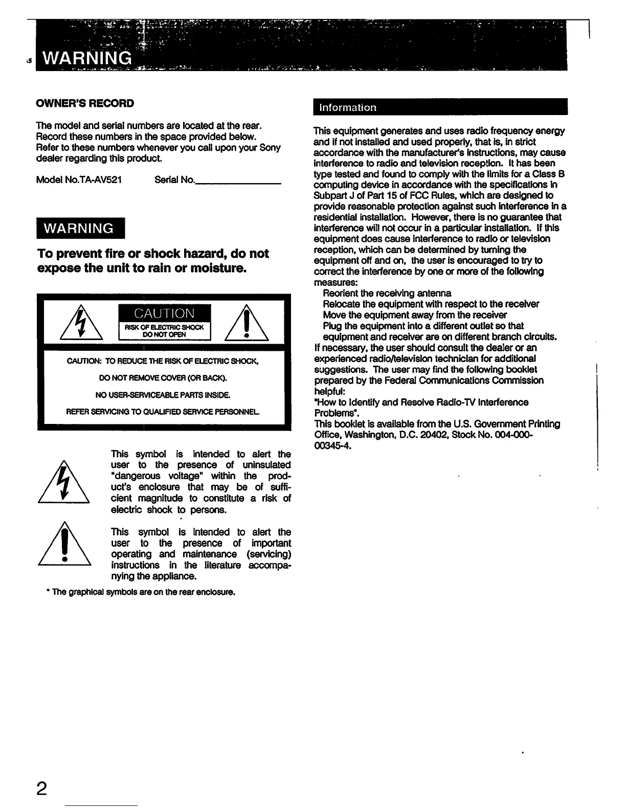 Sony TA-AV521 - WARNING; OWNERS RECORD; Information