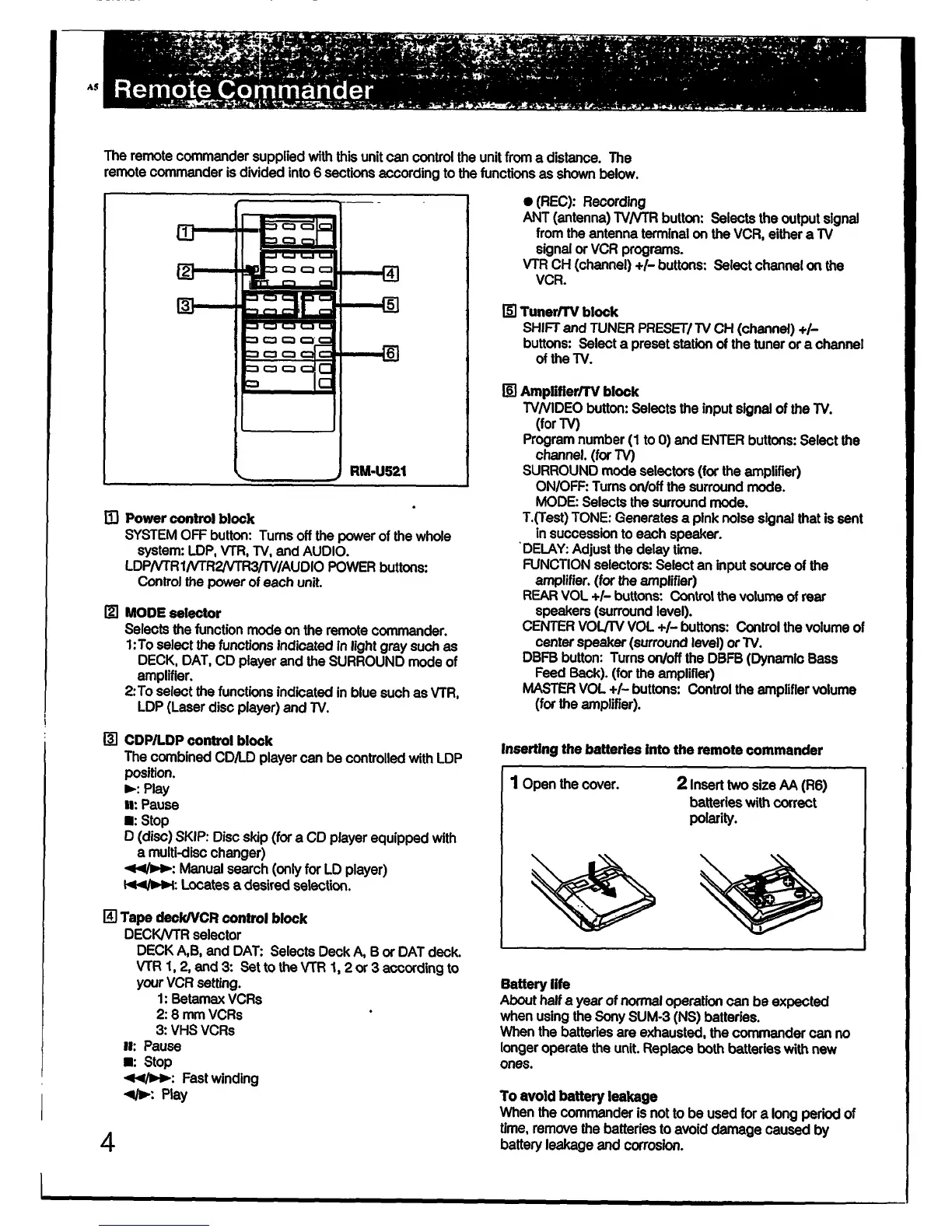Sony TA-AV521 - Remote Commander; Inserting the Batteries into the Remote Commander; Battery Life; To Avoid Battery Leakage