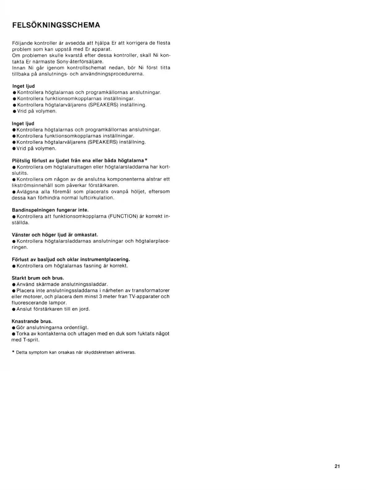 Sony TA-AX2 - FELSÖKNINGSSCHEMA; Inget ljud; Plötslig förlust av ljudet från ena eller båda h*ögtalarna; Bandinspelningen fungerar inte.