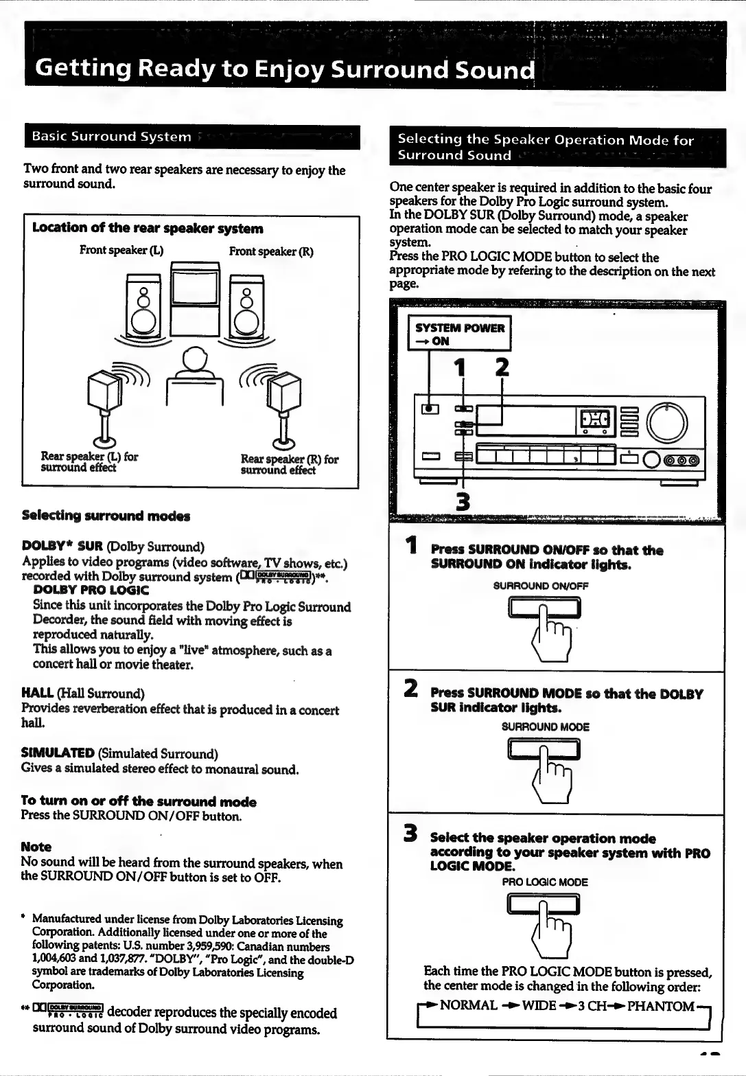 Sony TA-E741 - Surround Sound Setup; Basic Surround System; Selecting Surround Modes; Speaker Operation Modes