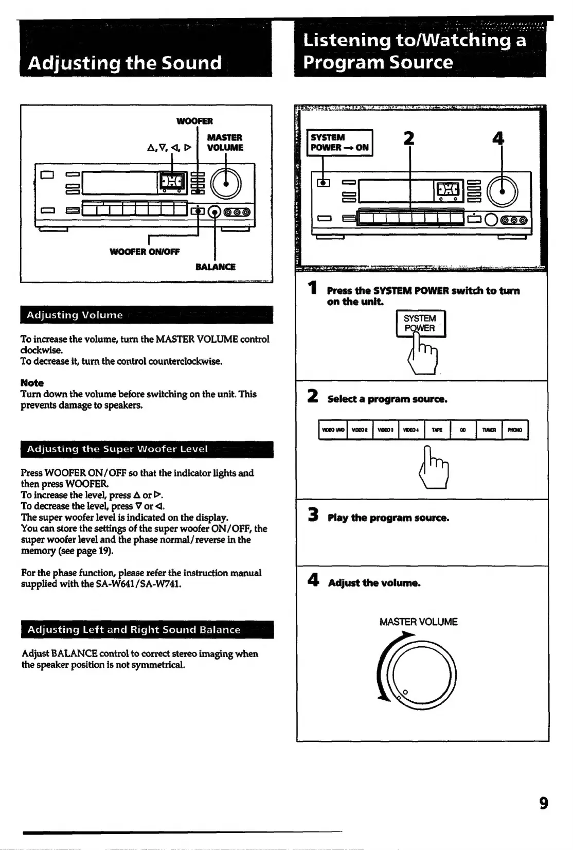 Sony TA-E741 - Adjusting the Sound; Adjusting Volume; Adjusting the Super Woofer Level; Adjusting Left and Right Sound Balance