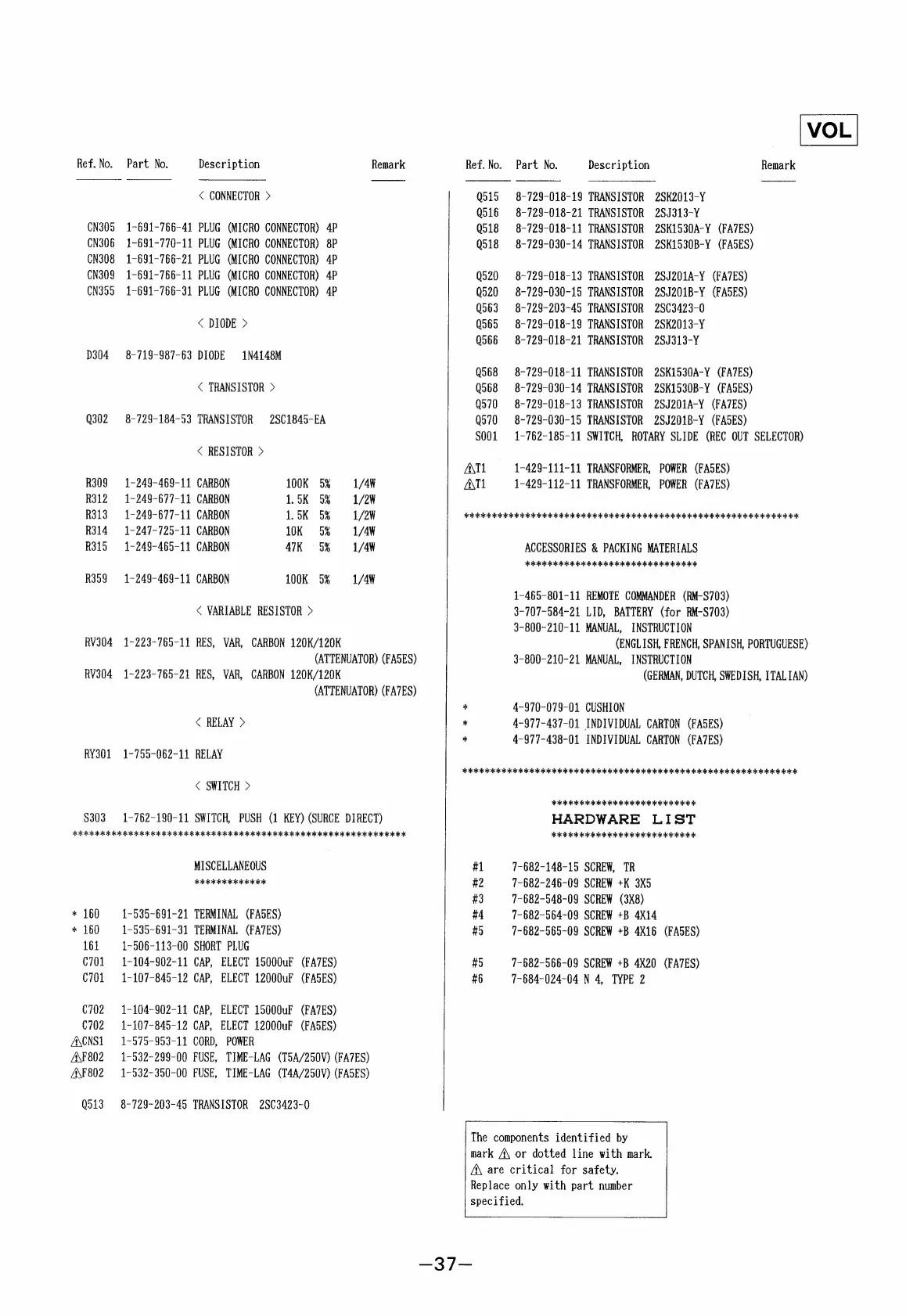 Sony TA-FA5ES - Electrical Parts List (Volume Section); Volume Control Parts