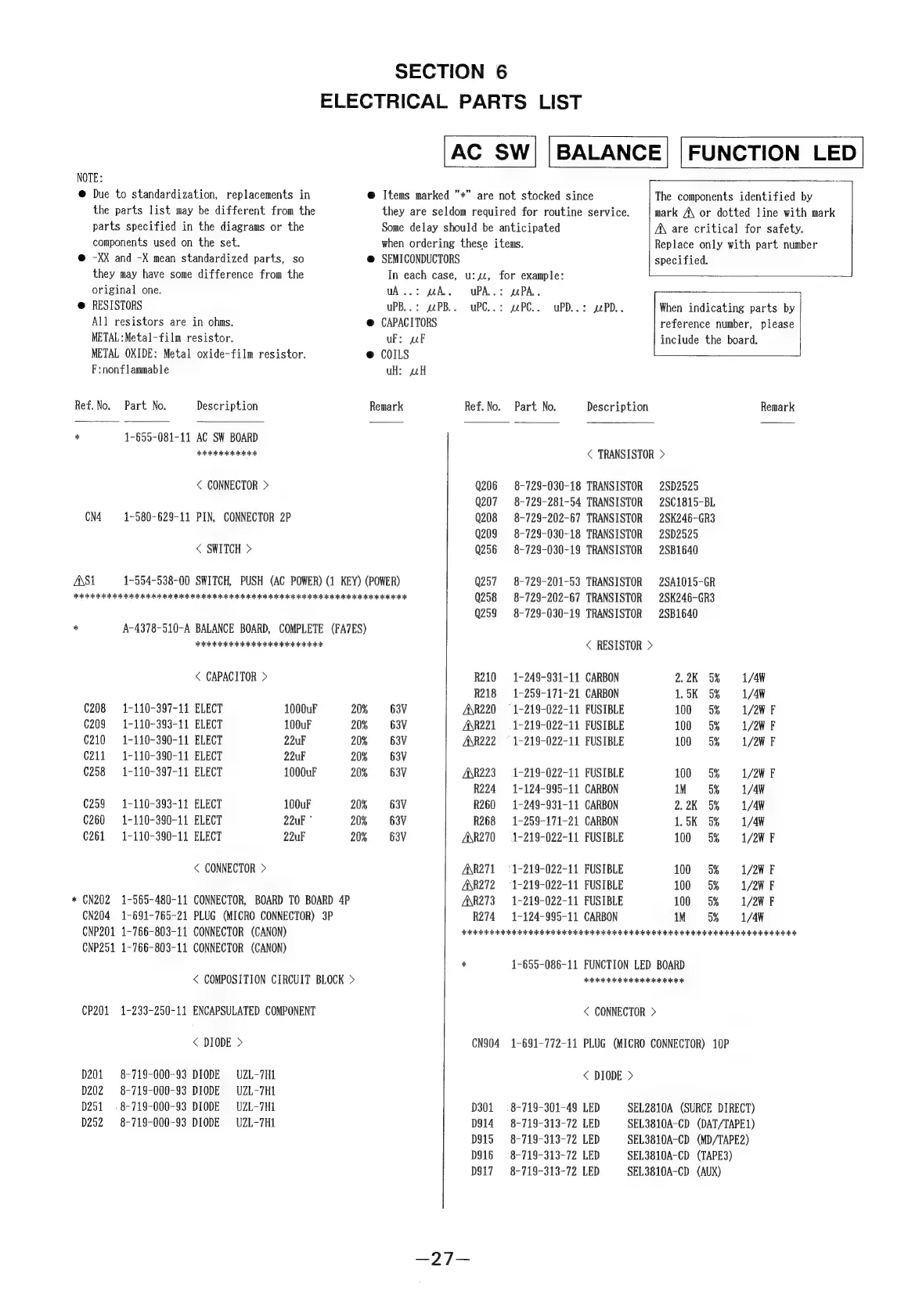 Sony TA-FA7ES - Electrical Parts List and Component Details; Electrical Components by Section