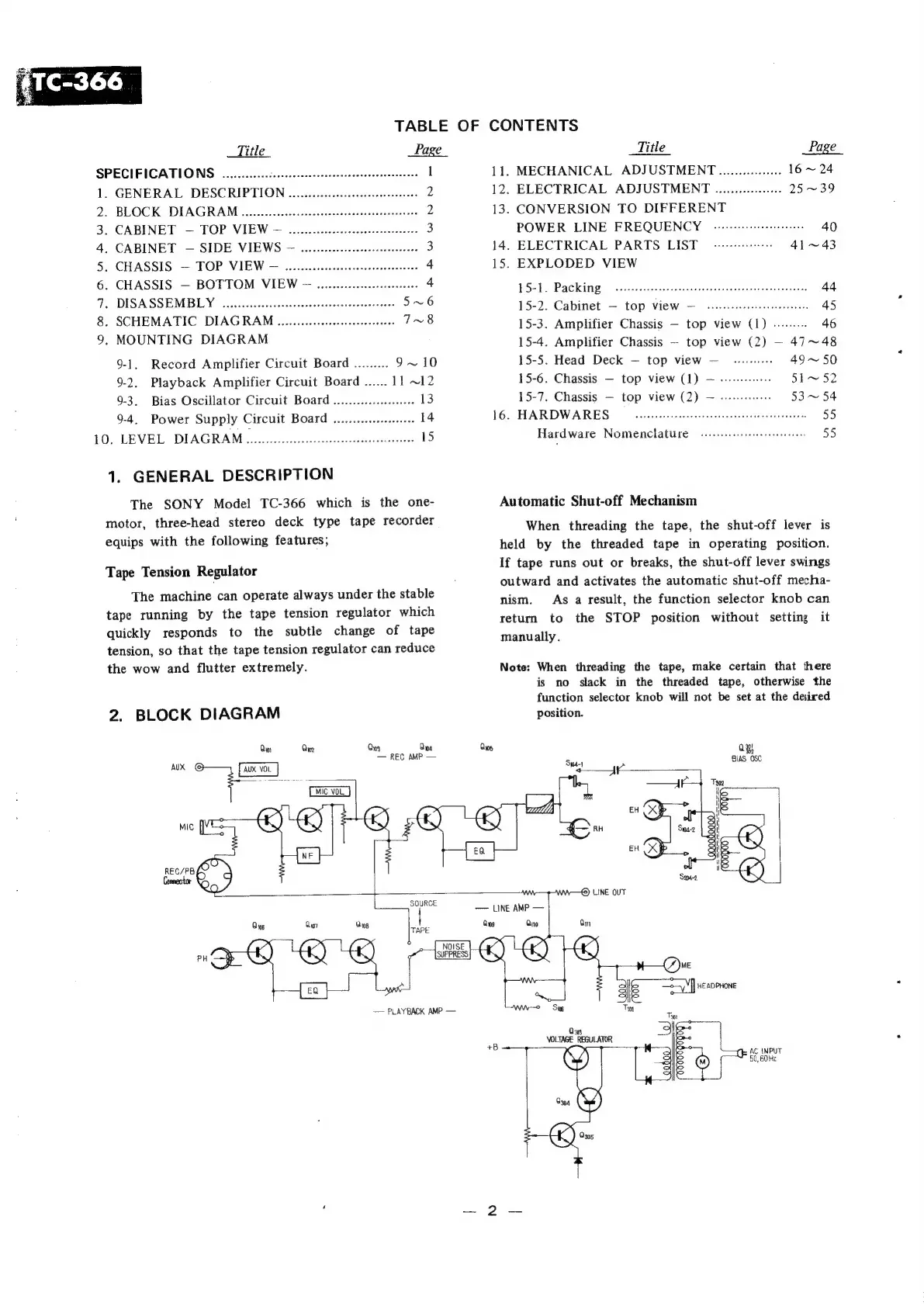Sony TC-366 - General Description; Tape Tension Regulator; Automatic Shut-off Mechanism; Block Diagram