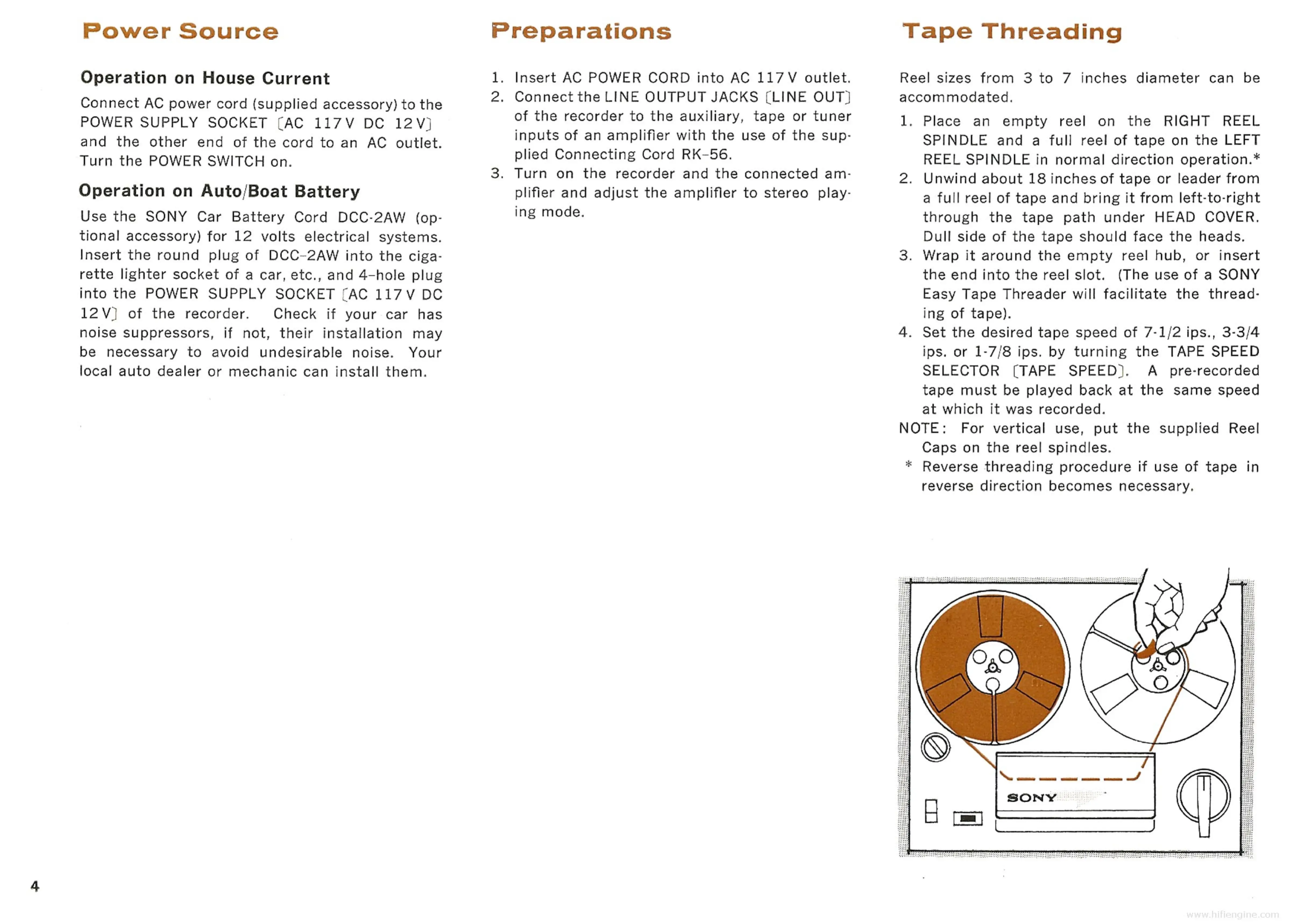 Sony TC-560D - Setup and Preparation; Power Source; Preparations; Tape Threading