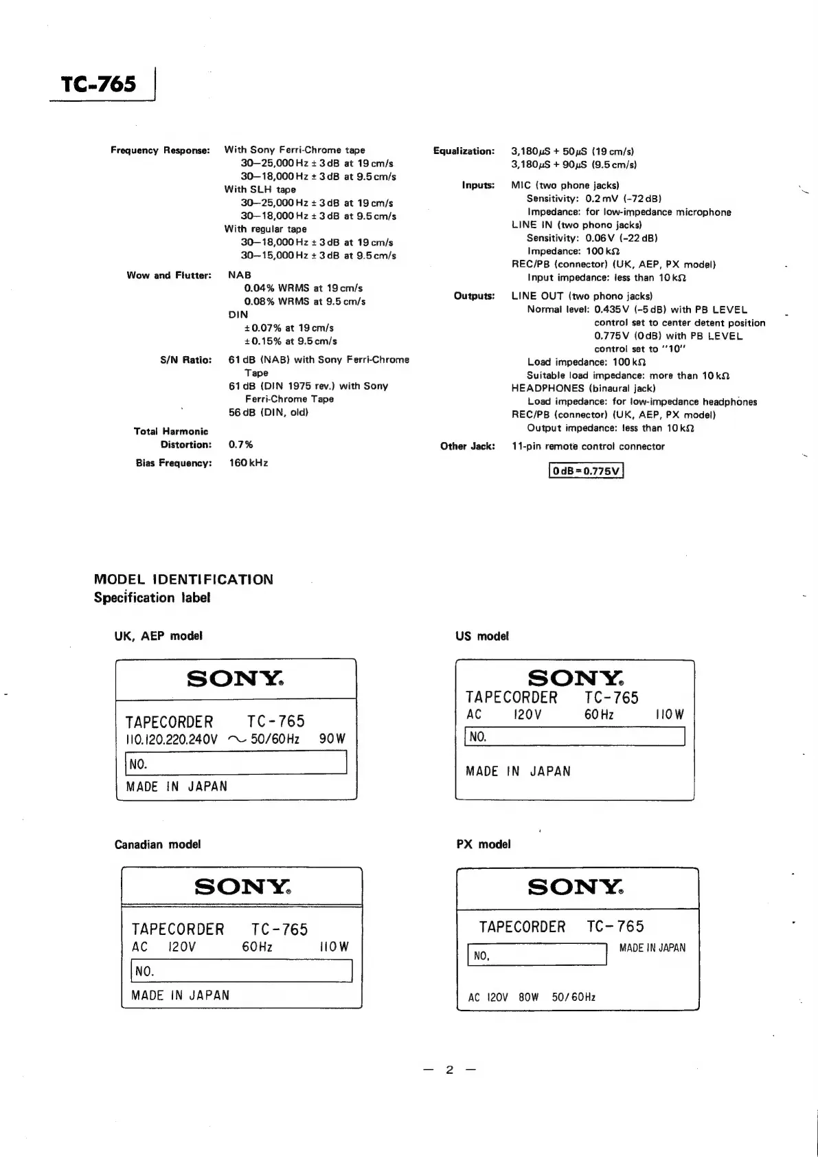 Sony TC-765 - Performance Specifications; Electrical Performance Metrics; Input;Output and Model Details