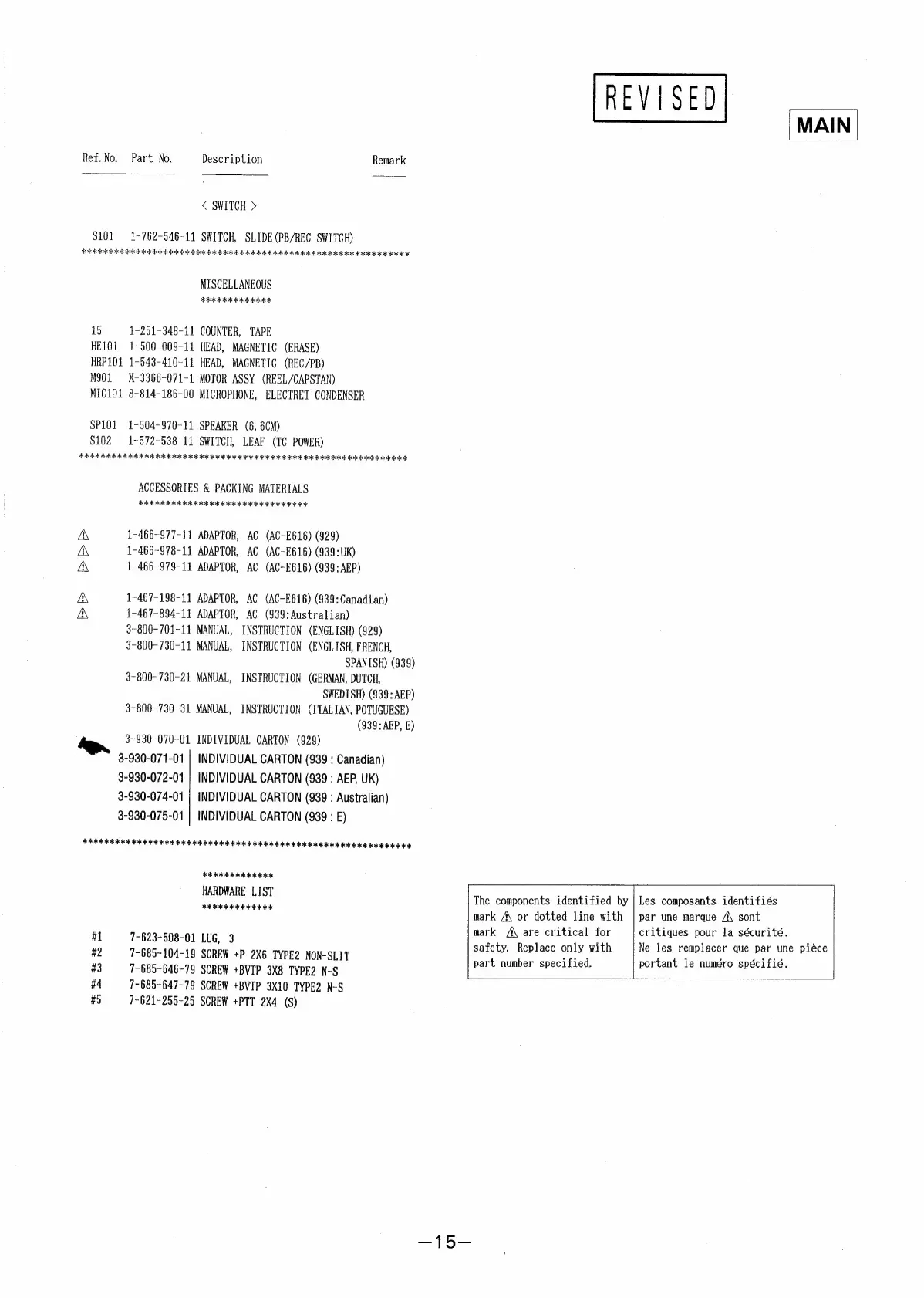 Sony TCM-939 - Accessories and Packing Materials; Hardware List