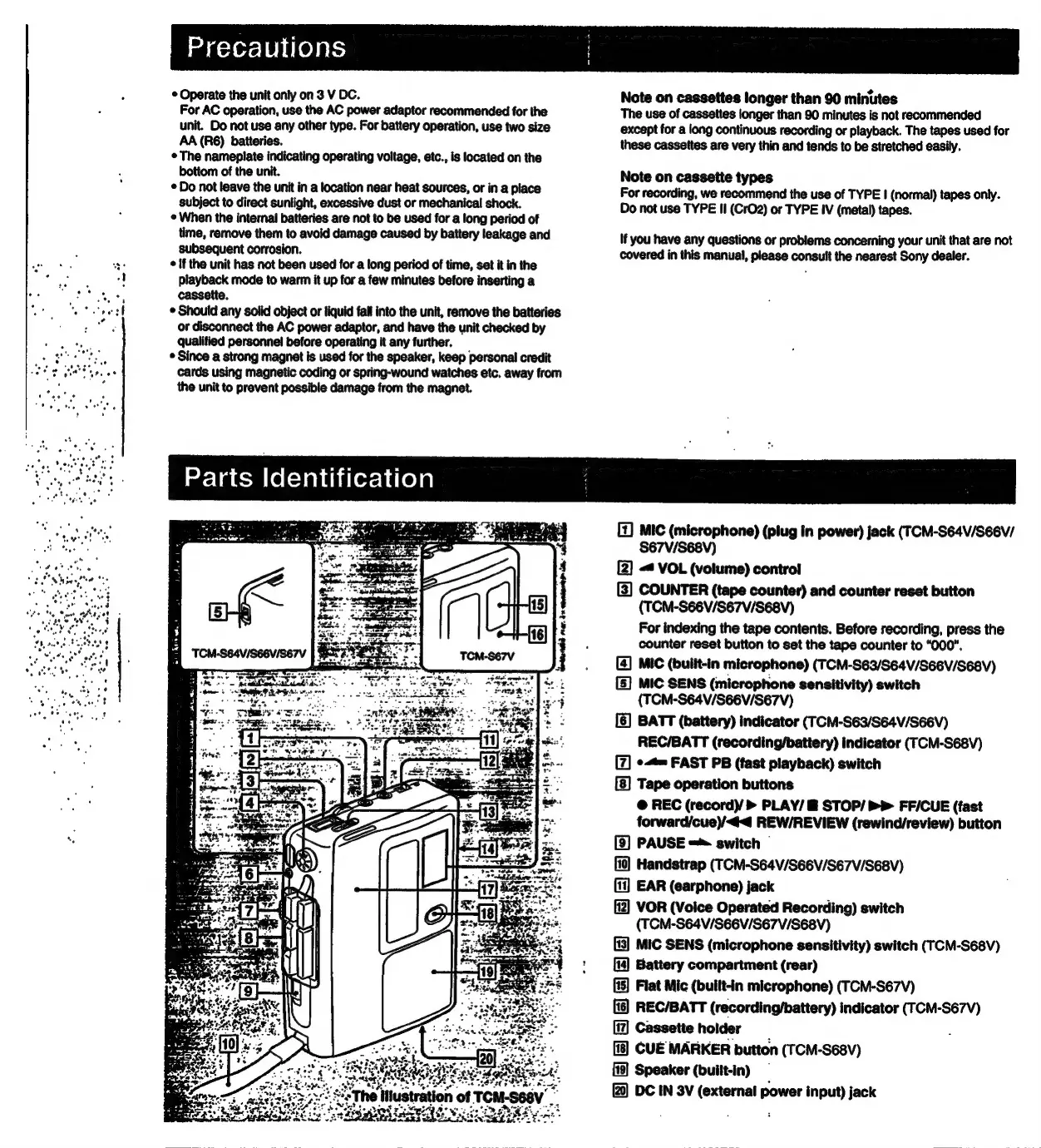 Sony TCM-S63 - Precautions; General Operating Precautions; Cassette Usage Notes; Parts Identification