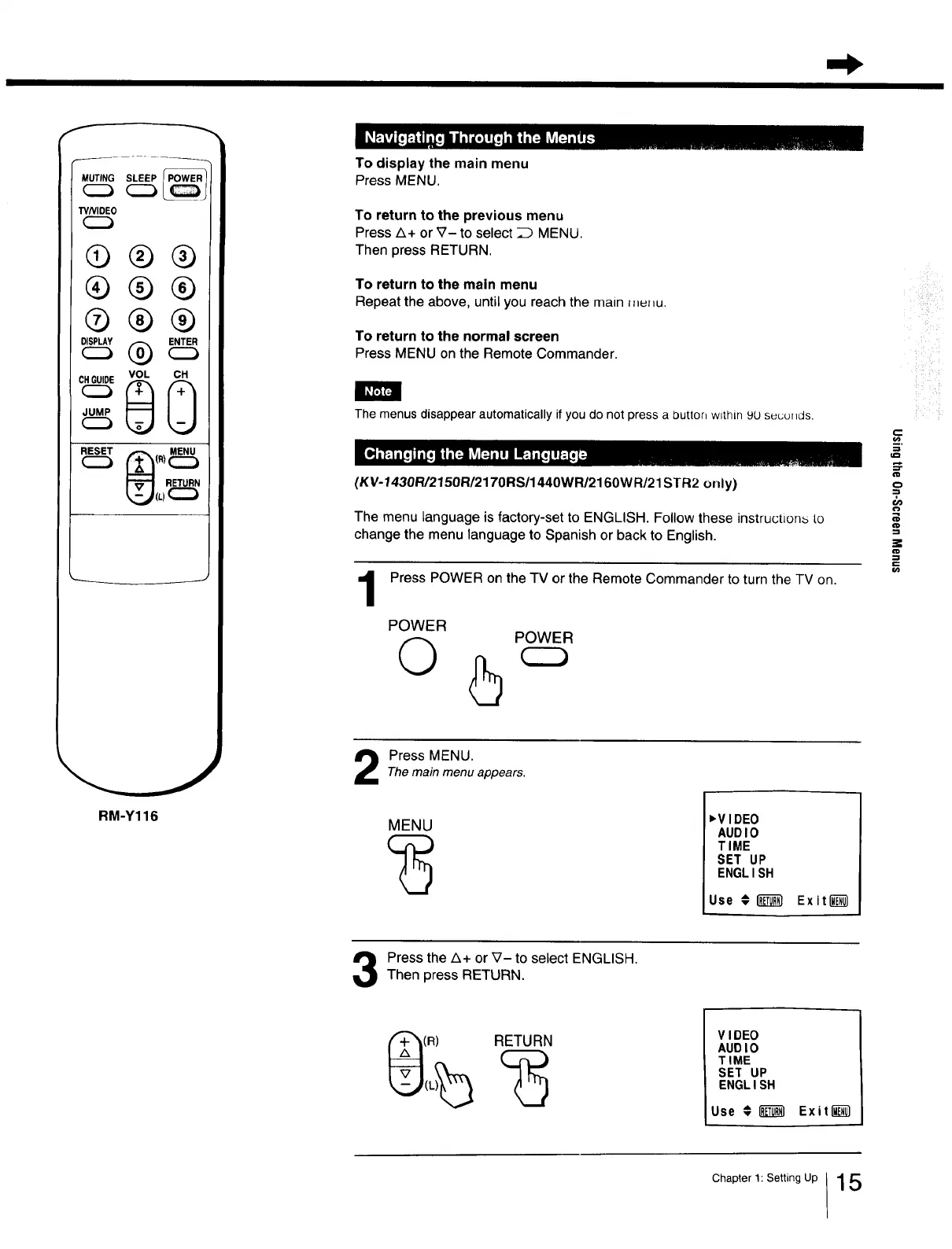 Press the A+ or V- to select ENGLISH.Then press RETURN.