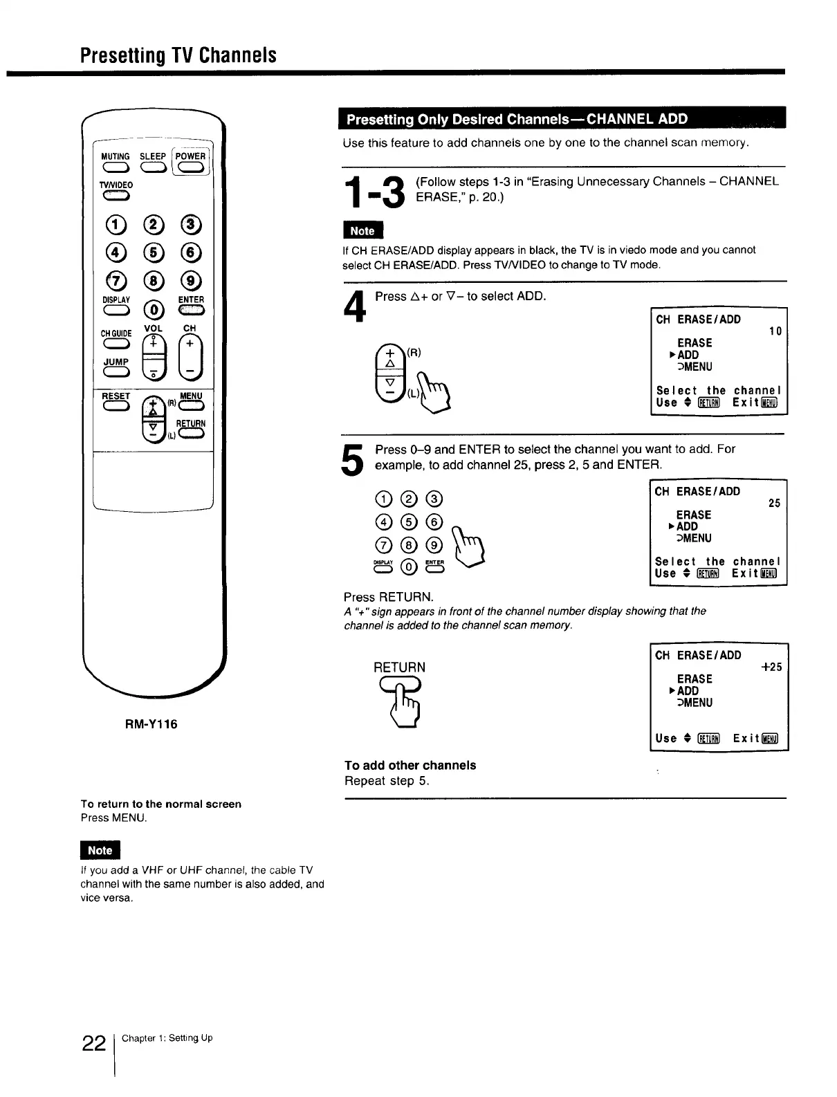 example, to add channel 25, press 2, 5 and ENTER.